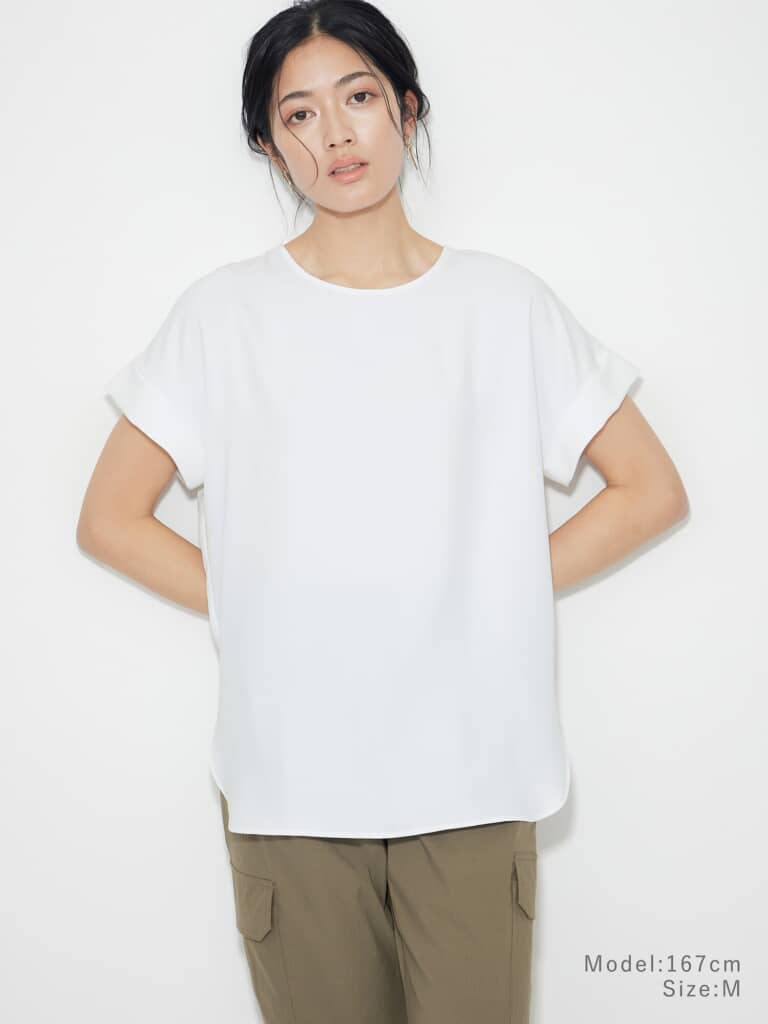 レーヨン混のポリエステル素材は、独特のさらっとした肌触りに加えて接触冷感機能を備えており、暑い日も快適に過ごせる工夫がされています。ほどよく透け感のある8分袖は、抜け感と涼しげな印象を演出。また、しわになりにくく、洗濯機で洗える手軽さもうれしいポイントです。価格は税込2480円と手頃で、日中の寒暖差や冷房対策に、すっと活躍してくれる頼れるアイテムといえるでしょう。