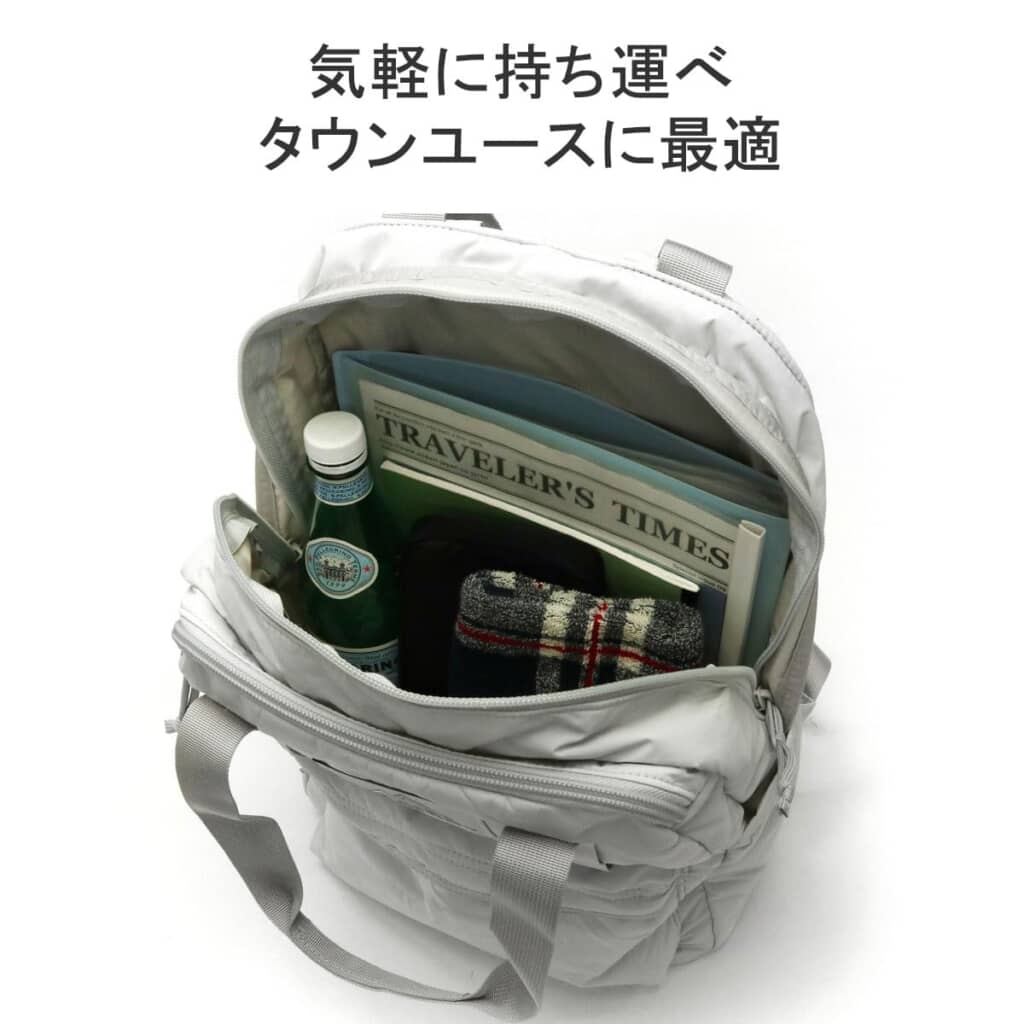 「イージーピージーデイ」はクラシックデイシリーズの中でも“軽快さ”を重視したモデルです。本体素材はナイロン100%、底部には補強裏地を追加。トップのグラブハンドルと取り外し可能なスターナムストラップを組み合わせることで、手提げと背負いの2WAY運用が可能です。