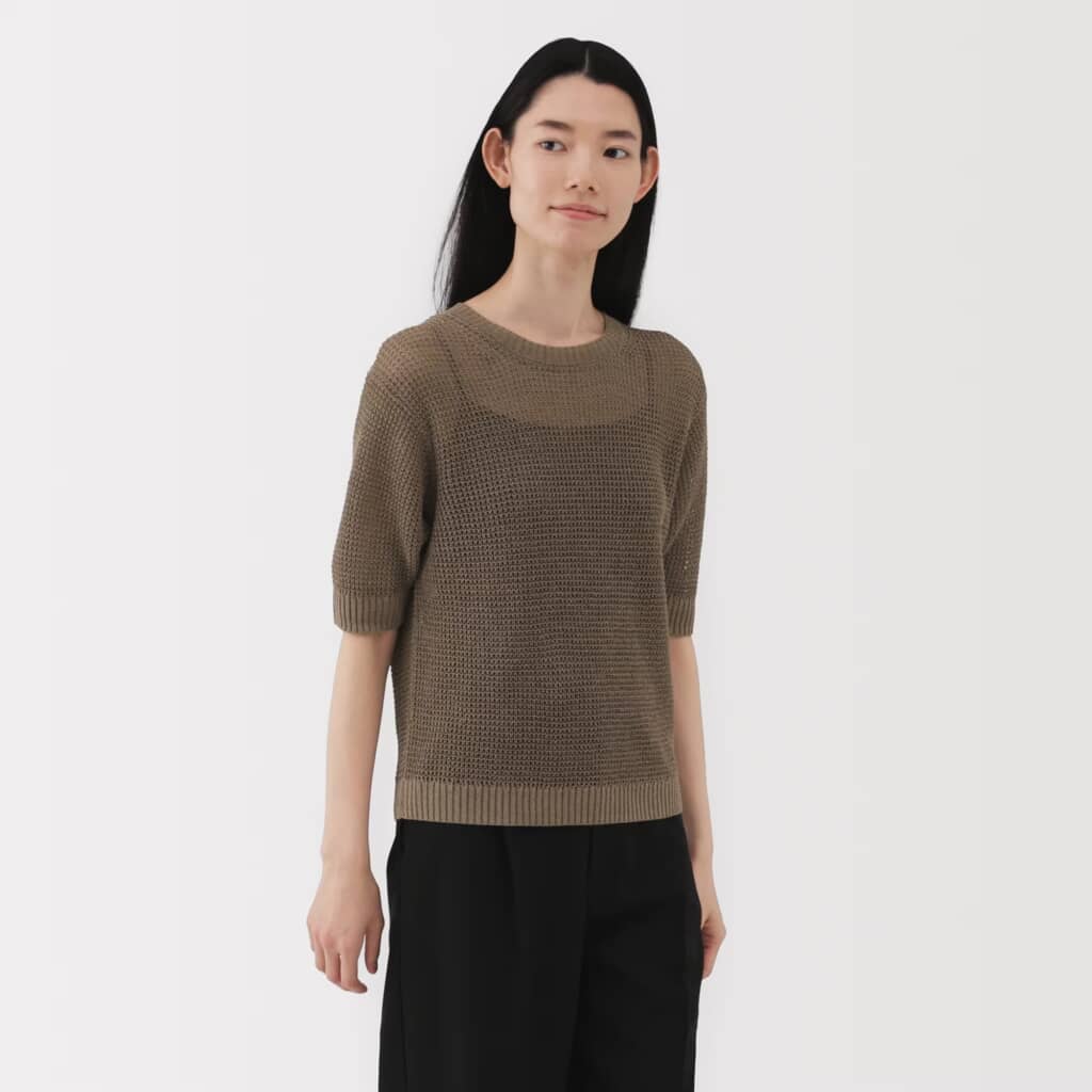無印良品の「婦人 ヘンプ混メッシュ五分袖セーター」は、ヘンプと伸縮性のある糸を撚り合わせた素材が特徴の一枚。透かし編みによるメッシュ生地なので、清涼感のある着心地を実現しています。ベーシックなクルーネックデザインと、コーディネートしやすい4色展開がうれしいポイントです。