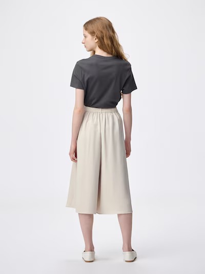 GUの「ドレープキュロッツQ」は、パンツでありながらスカートのように揺れるフレアシルエットが優雅な一本です。裾に向かって広がるラインが脚さばきを軽やかで、ウエストは総ゴム仕様でラクなはき心地。ベルトループ付きなので、ベルトでアクセントを加えることも可能です。前面左右にポケットを備え、30 NATURALのみ裏地付きで透け感を防ぎます。カラーは4種類、価格は2990円で販売されています。