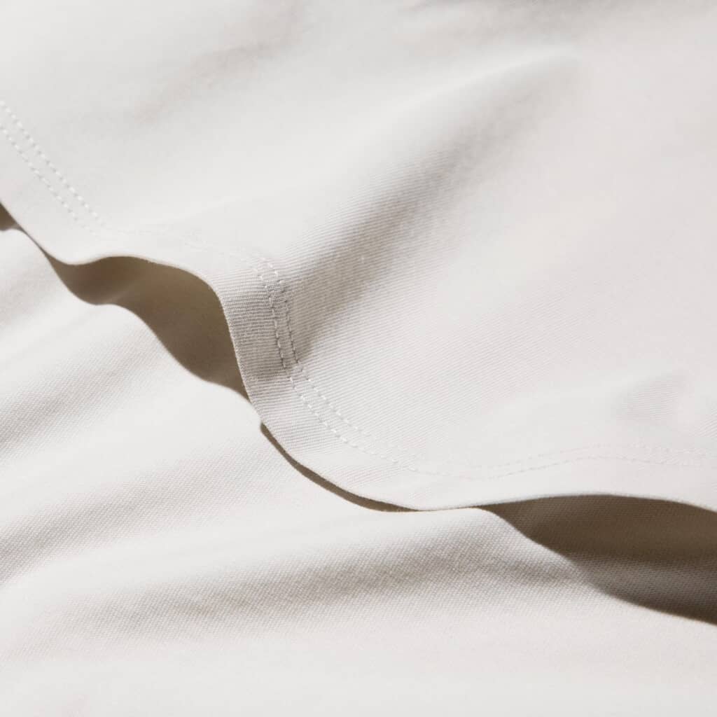 無印良品の「婦人 天竺編みフレンチスリーブTシャツ」は、アフリカの自然が育んだ綿と再生ポリエステルを使用した素材で仕立てられた一着。さらりとした肌ざわりと乾きやすさが特徴で、綿100%に比べて快適な着心地を実現しています。デザイン面では、前シリーズのフィット感を保ちつつ、襟元を細めのリブに変更し、ネックラインの深さも調整。カジュアル感を抑えた、よりクリーンな印象に仕上げています。