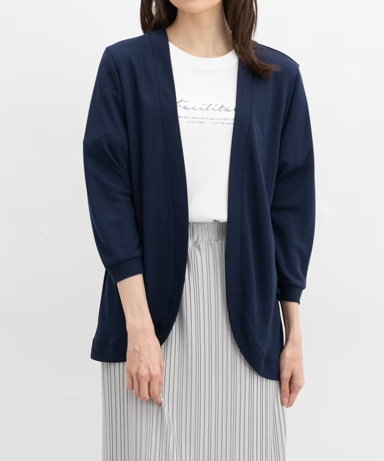 デザインはボタンレスでさらっと羽織れるラウンドネック仕様。8分袖と腰回りを隠せる丈感により、体型カバーもかなえます。薄手で軽いので、カバンに入れての持ち歩きや旅行先での冷房対策にも便利です。