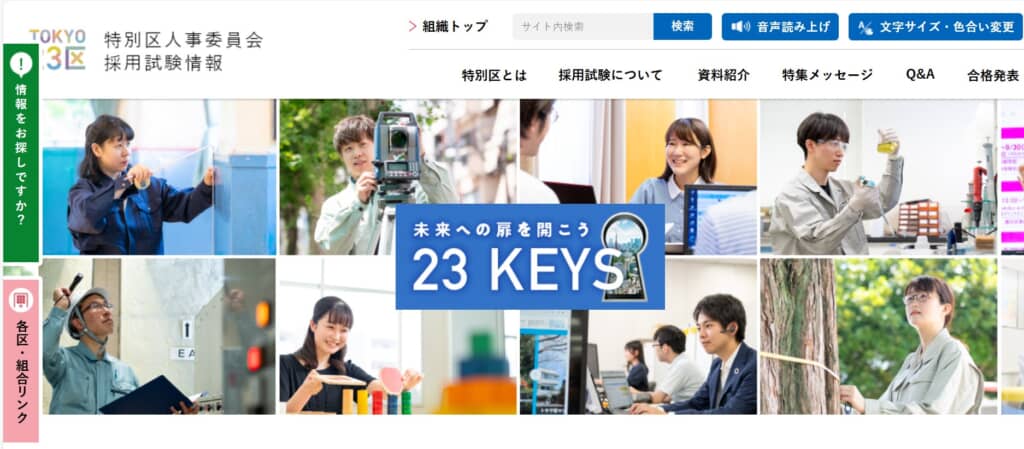 東京都特別区(東京23区)の仕事は、「一般事務」「ICT」「土木」「造園」「建築」「機械」「電気」「福祉」「心理」「衛生」「化学」「保健師」といった12の職種から構成。東京都の人口の約7割が集中する特別区において、生活保護や保育園整備、ごみ処理、リサイクル関連業務など、区民の生活に直結する業務を担当しています。