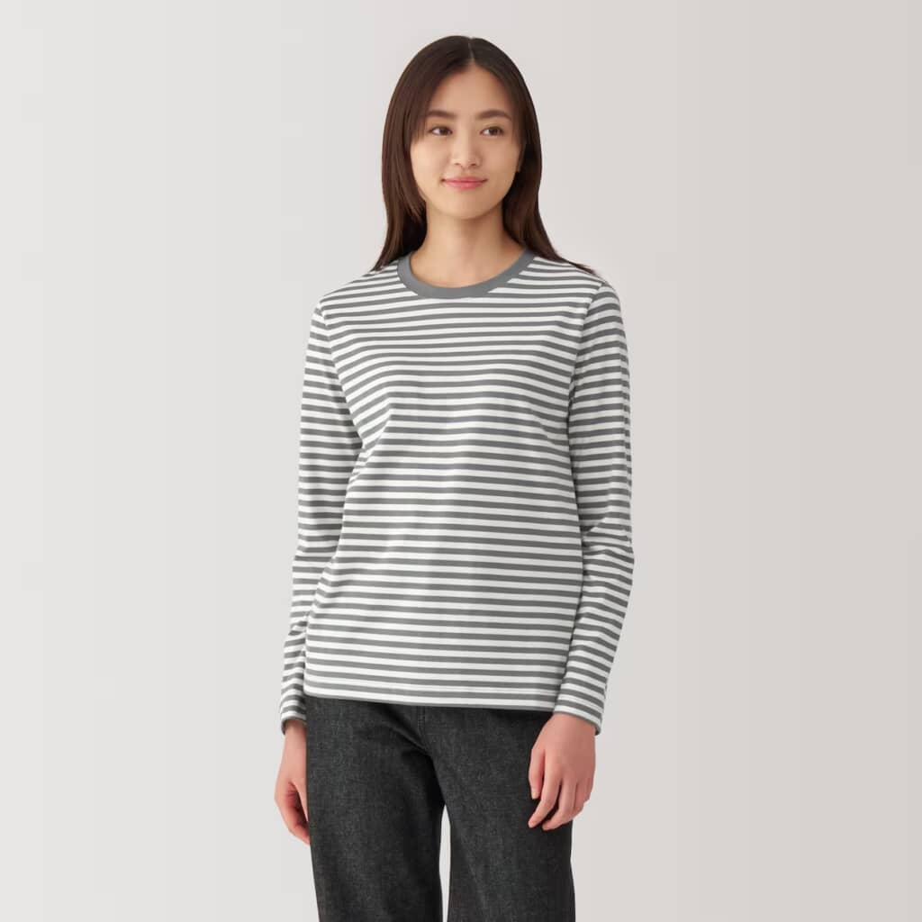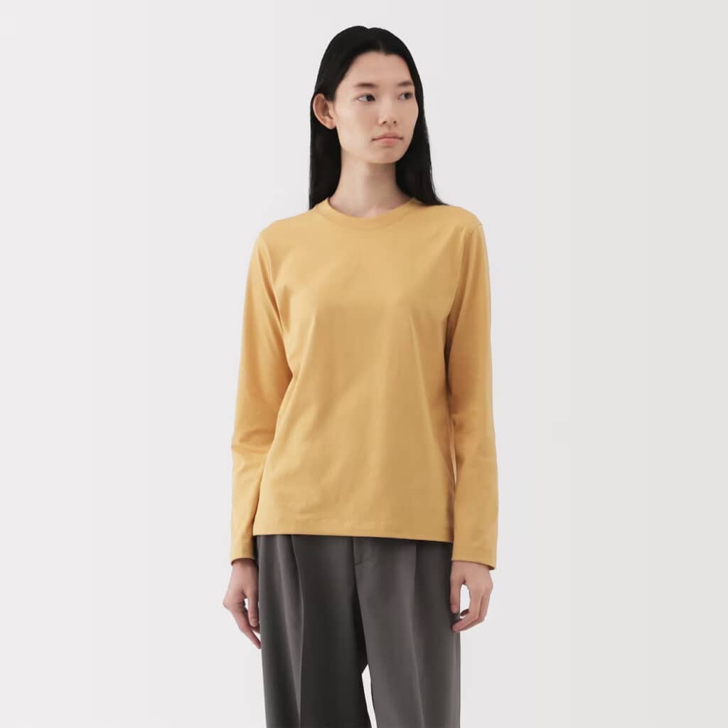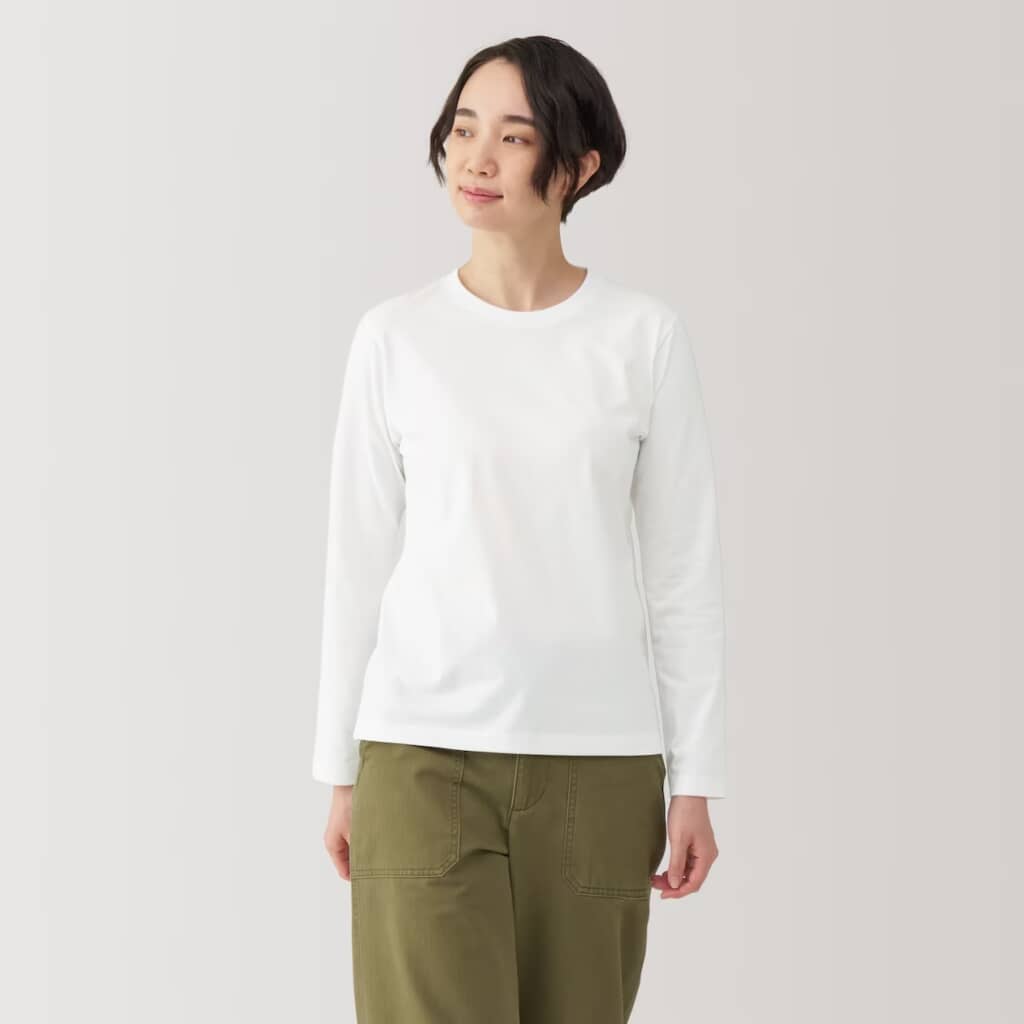 無印良品の「婦人 天竺編みクルーネック長袖Tシャツ」は、綿×ポリエステル混の天竺生地がさらりと快適で、洗濯後に乾きやすいと好評です。