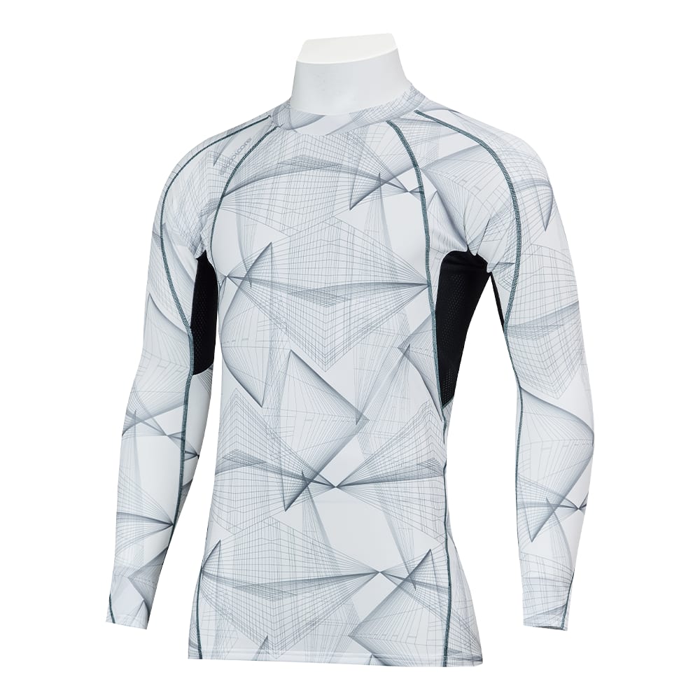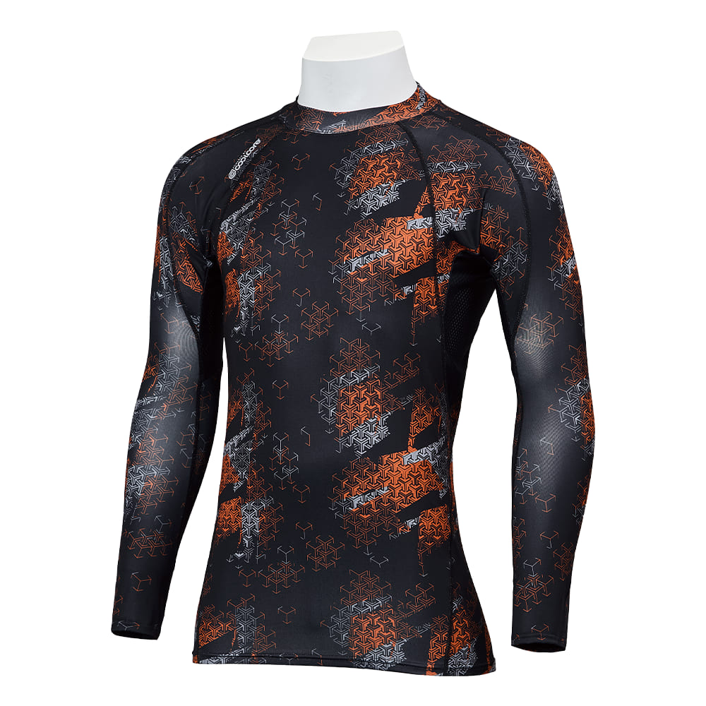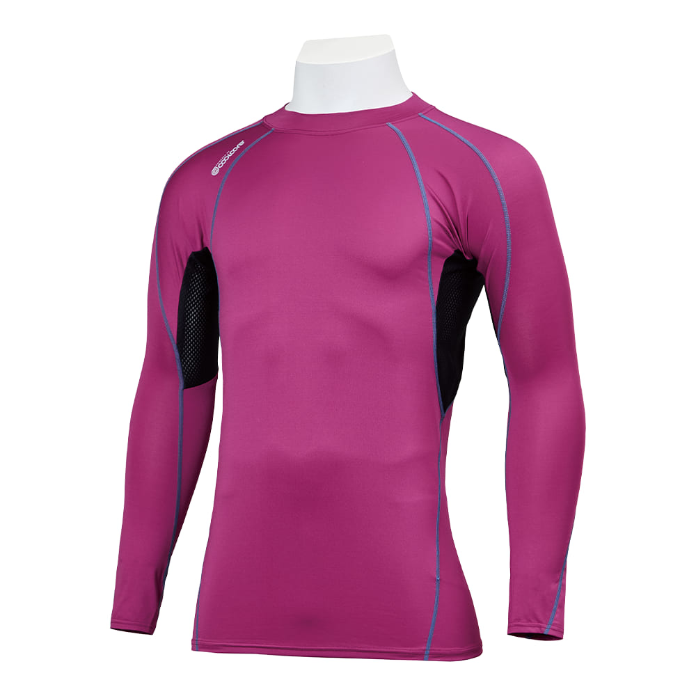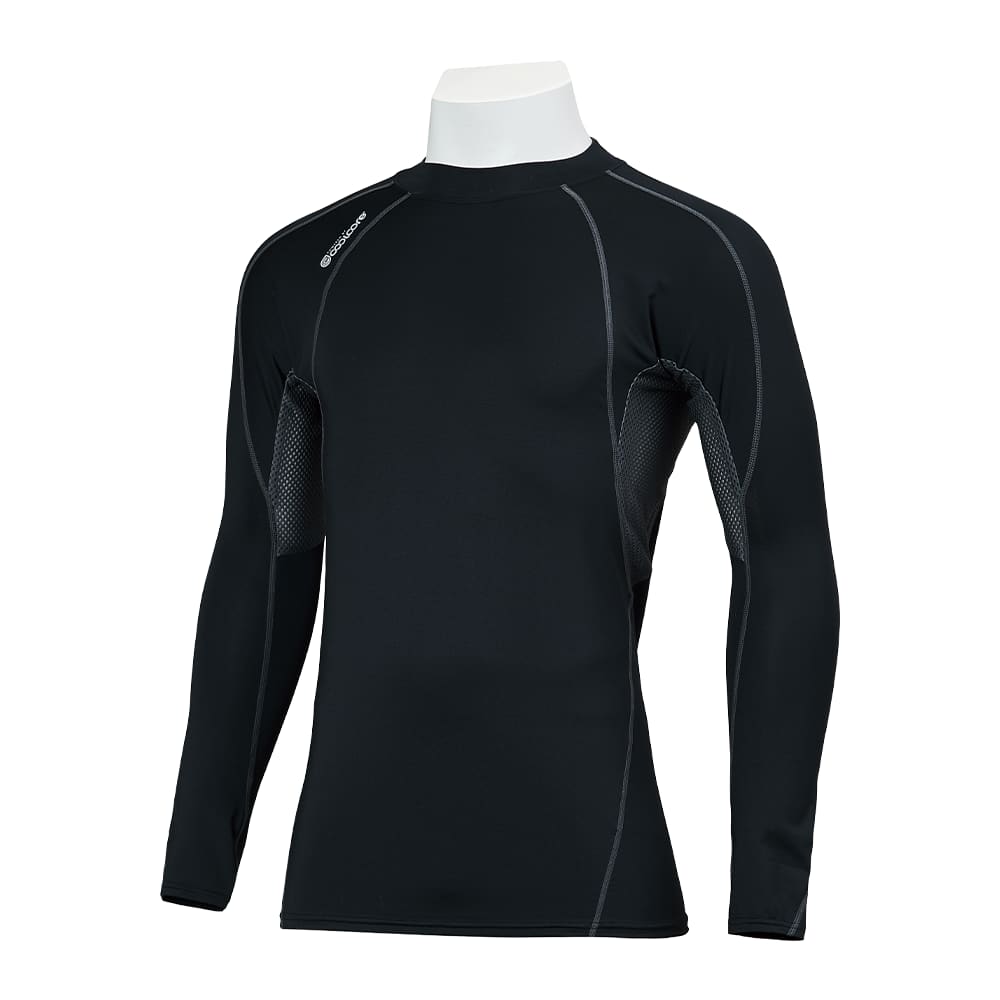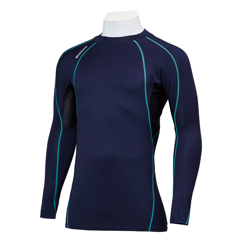 「クールコア(R)冷感 長袖ミドルネック」(1900円)は、気化熱を活用して着用者をひんやりと冷やす特殊素材を採用した夏向けインナーウェアです。汗や水分と反応することで冷感が湧き起こり、運動や炎天下での作業時に快適です。脇下に配置されたメッシュはポリエステル100%で通気性を確保。吸汗速乾性に優れ、ムレを防ぐ構造となっています。
