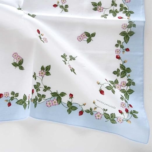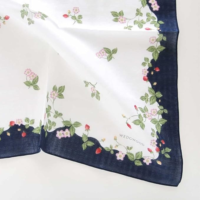 柄はウェッジウッドの代表的なワイルドストロベリー模様をあしらっており、繊細ないちごと葉のモチーフが可憐な雰囲気を演出。カラーバリエーションとしては、ネイビーのほか、ブルー(ライトブルー系)も展開されており、どちらも同じく約46センチ角、綿100%、日本製となっています。価格は税込660円程度と手に取りやすく、日常使いにも、ちょっとした贈り物にもぴったりです。