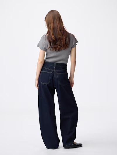 GUの「バレルレッグジーンズ(丈標準71.0~75.0cm)」は、絶妙な加工感が特徴のジーンズ。膝からワイドに広がりつつ裾へ向けて緩やかにテーパードさせたシルエットが特徴で、ボリュームとシャープさを両立しています。横のシームを前振りにすることで視覚的に重心を下げ、立体的なフォルムを演出。さらに膝内側に配したダーツがデザイン性を高め、加工の味わい深さとすっきりした穿き心地を同時に楽しめます。