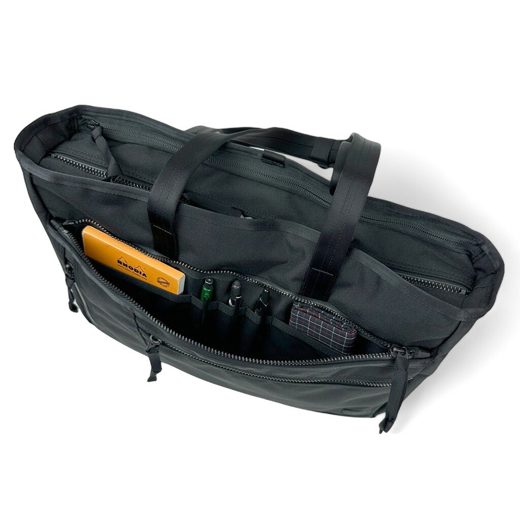そんなポーターのなかでも、「ポーター インタラクティブ トートバッグ 536-16155」は、日々のビジネスシーンにフィットする機能性と軽量性を兼ね備えた、ベーシックながらも頼れるトートバッグです。600デニールのポリエステルオックスを本体素材に、裏面にはTPU(サーモプラスチックポリウレタン)加工を施した生地を採用。A4サイズに対応した1層構造で、肩掛けも可能な長めのハンドル設計になっています。外装には複数個所のファスナーポケットが配置されていて、頻繁に出し入れしたいアイテムの収納にぴったり。内装にも、ペンホルダー3本分、PCポケット、ペットボトルホルダー2本分など、豊富なポケットがあるので、荷物の細やかな仕分けが可能です。また、トロリーバー通し機能も搭載されており、出張などの移動時にも快適に使える工夫が詰め込まれています。