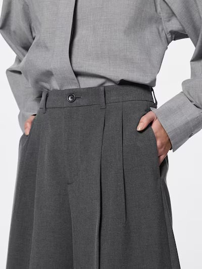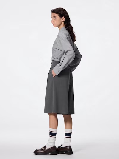 「UNIQLO : C」最新作の「キュロット」は膝下丈のクロップド設計で足さばきが軽快。裾幅をたっぷり取ったフレアラインによりスカート感覚ではける一方、パンツ仕様なのでアクティブシーンでも安心です。生地はリサイクルポリエステル62%を含むツイル調ストレッチで、縦横に伸びる2WAYストレッチと滑らかなドレープを両立。背面ウエストはゴム、フロントはタック+ホック留めで着脱もスムーズです。深め股上とポケット付きで機能面も◎。