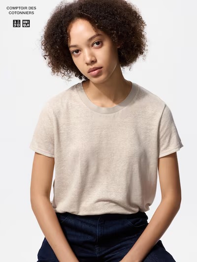 ユニクロから販売されている、「COMPTOIR DES COTONNIERS(コントワー・デ・コトニエ)」とのコラボ商品「リネンクルーネックT/半袖」が、涼しく着られてシルエットも美しいと高評価を集めています。