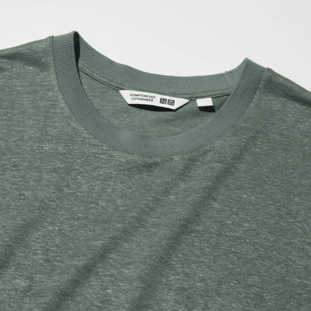コントワー・デ・コトニエとユニクロのコラボ商品である「リネンクルーネックT/半袖」は、身頃にナチュラルな風合いと独特の落ち感を楽しめるリネン100%を使用した、軽やかな着心地が特徴のTシャツ。襟はリネンではなくフラットニット仕立てで、スポーティかつ洗練された印象をプラスしています。