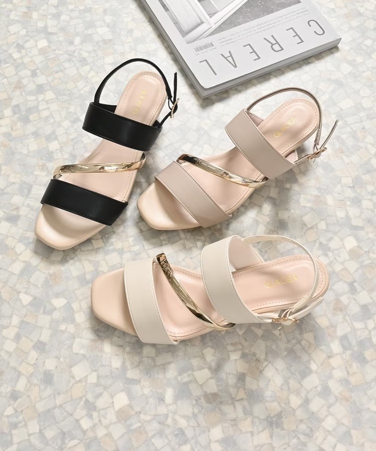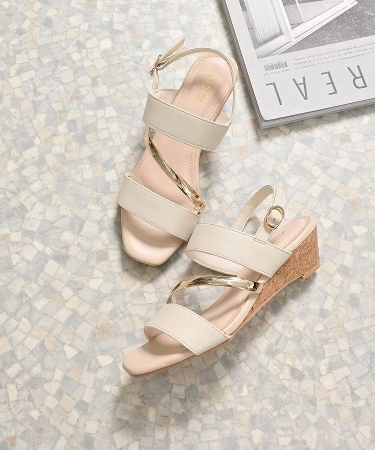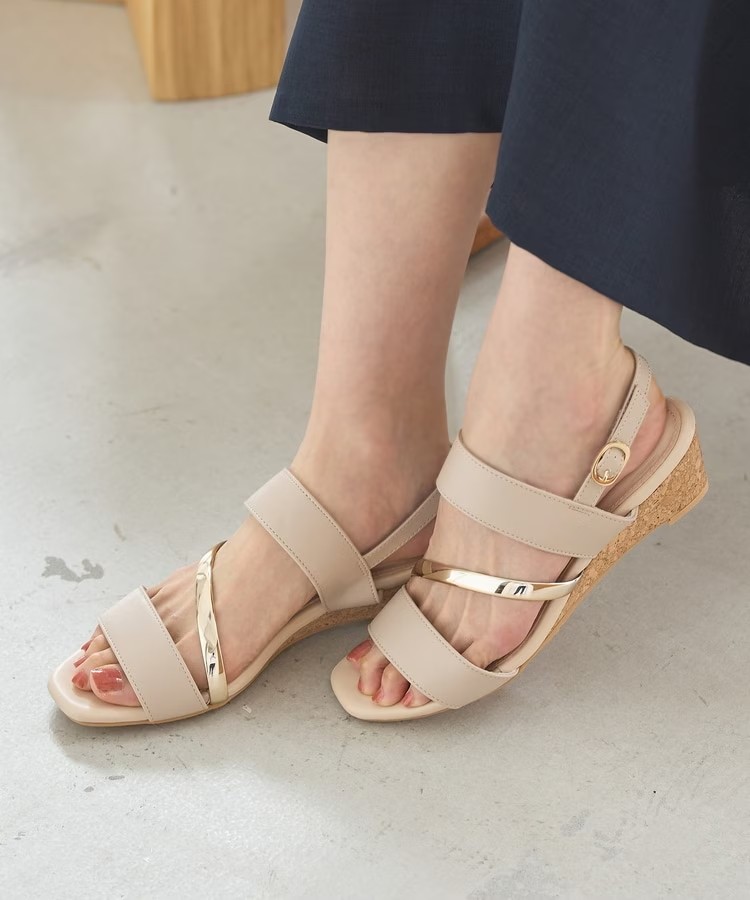 ハニーズの「ウエッジヒールサンダル」(1980円、8月6日時点)は、夏らしいウエッジソールを採用した一足で、見た目の華やかさと機能性の両方を兼ね備えています。フェイクレザー素材にメタリックなアクセントがプラスされており、シンプルながらも高見えする仕上がり。片手でスポッと履ける楽な設計で、脱ぎ履きの多い夏場にもストレスフリーです。