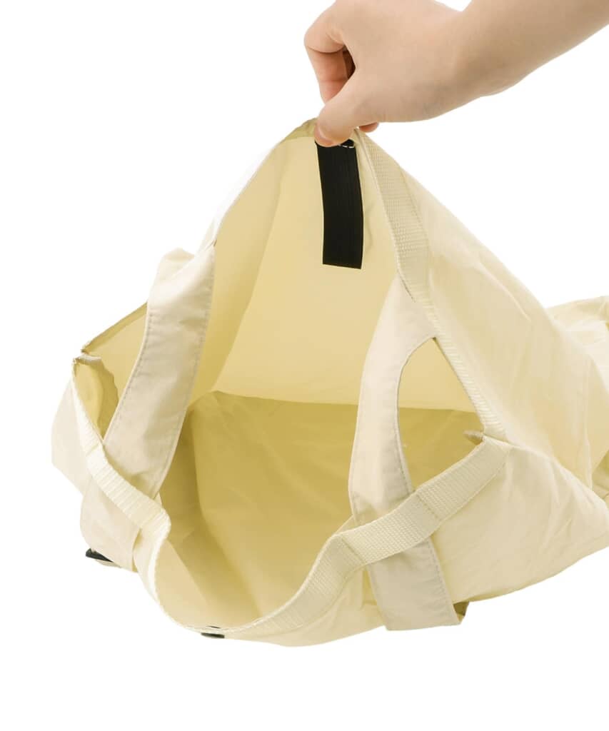 3COINSの「リュック2WAYエコバッグ」(税込み:550円)は、リュックにもなる2WAY仕様のエコバッグ。アジャスター付きショルダー紐を好みの長さに調節できるので、使用シーンや荷物の量に合わせて手持ちにもリュックにも変身します。バッグ内側にゴムバンドが付属しているので、使用後は折りたたんでまとめれば手のひらサイズに。バッグの開口部がボタンで留められるのも便利です。エコバッグとしてはもちろん、旅行先でのサブバッグとしても活躍してくれます。カラーはベーシックなベージュとブラックの2種類展開なので、コーディネートに合わせやすいのもうれしいポイントです。