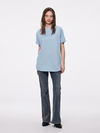 GUの「オーバーサイズT RS」(税込み790円)は、肩まわりをゆったりと包み込むようなオーバーサイズのシルエットが特徴。サイドには裾スリットが施されており、前だけタックインなどスタイルに変化をつけやすく、自然とこなれた印象に仕上がります。丈感はヒップが隠れる長さで、体型カバーにもひと役かいます。