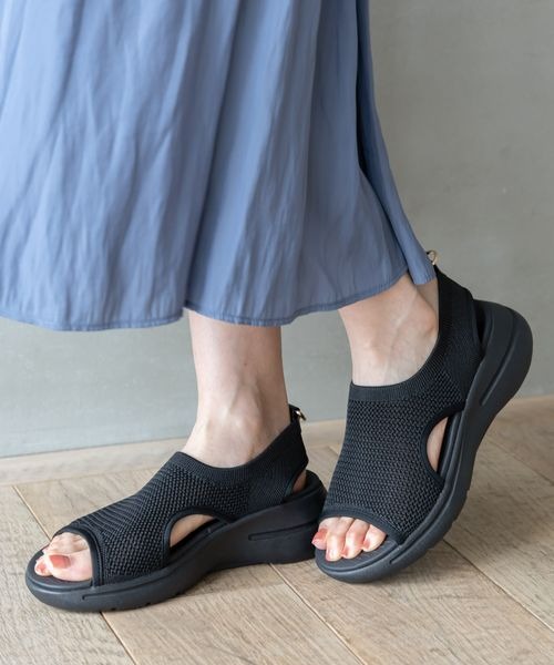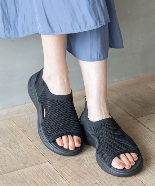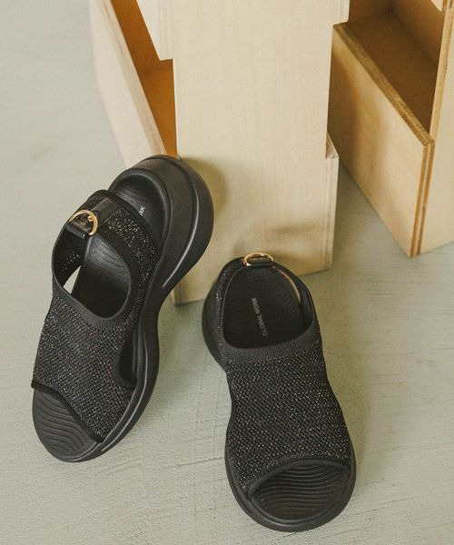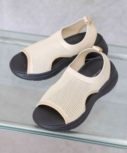 グローバルワークの「らくっションフィットサンダル/327974」は、透け感のあるアッパーのニット素材が印象的なアイテム。甲を覆う伸縮性のあるニットが足に心地よくフィットし、通気性にも優れています。インソールとソールは衝撃吸収力と軽さが特徴で、ぐにゅっとしたクッション感のある履き心地なのだとか。かかとの金属パーツはプルストラップとして活用でき、そのままスポっと脱ぎ履きしやすくなっています。カラーは「アイボリー」「ブラック」「ブラックラメ」の3色展開です。