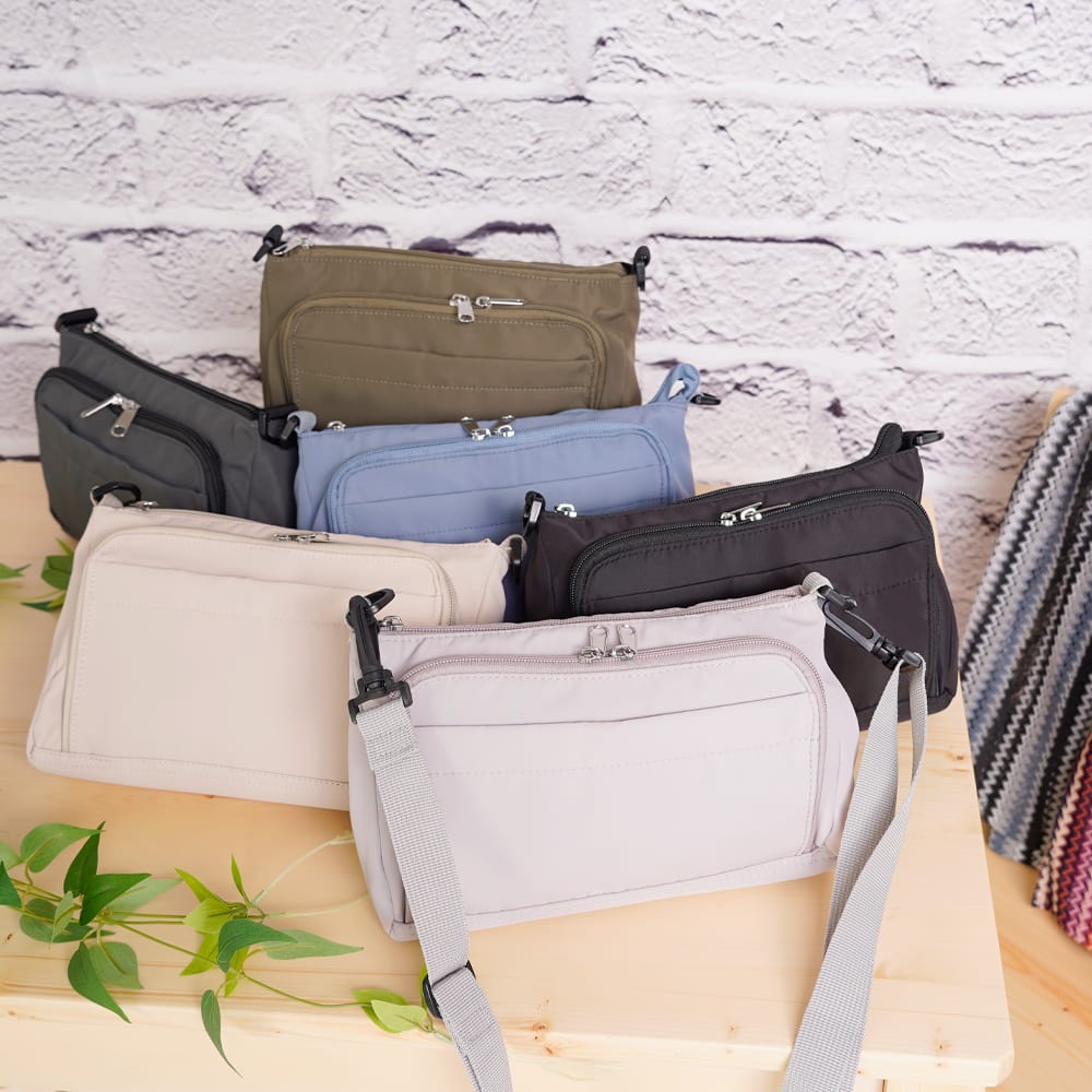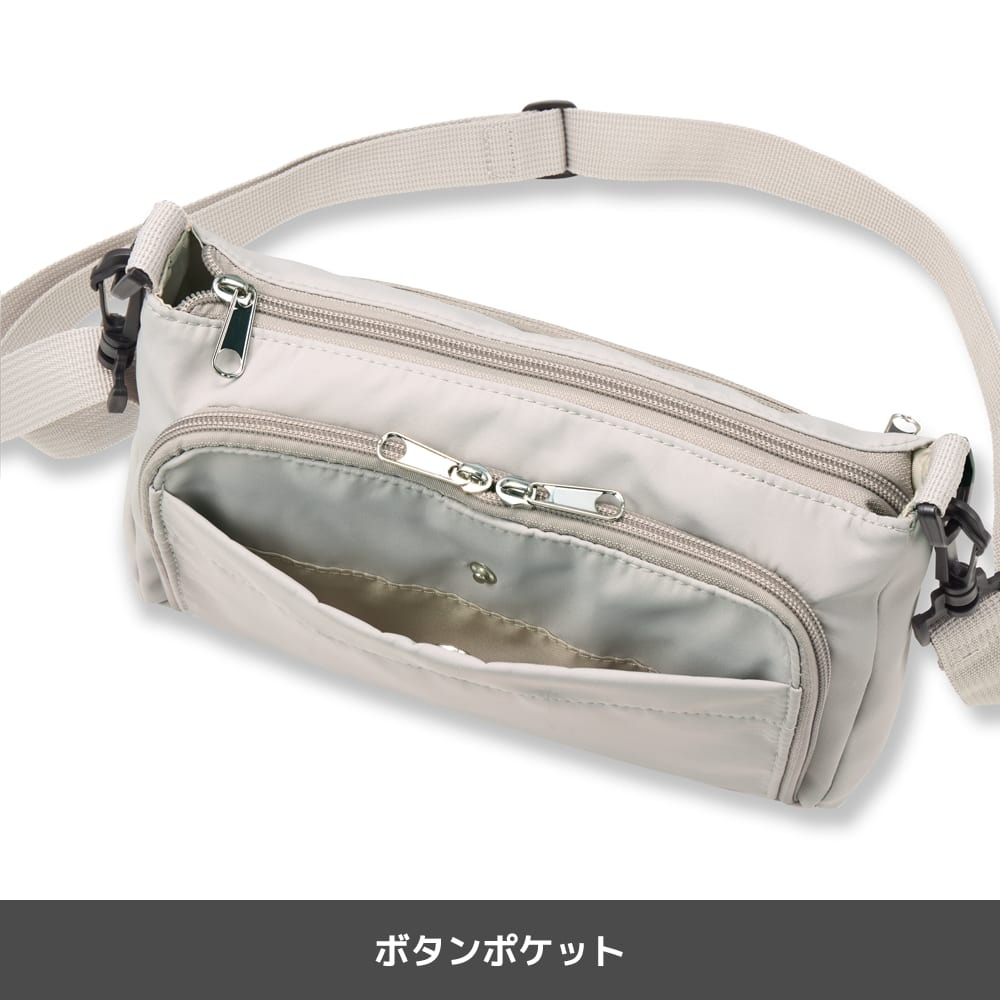 前面にはダブルファスナー仕様のポケットがあり、カードポケットやペンループを内蔵しているため、お財布代わりとしても活用可能。​背面のファスナーポケットはスマートフォンや定期券の収納に便利で、取り外し可能なショルダーベルトを外せば、大きなバッグの中にポーチとして収納することもできます。​​日常のお出かけ用から旅行のサブバッグまで、幅広いシーンで活躍するアイテムです。