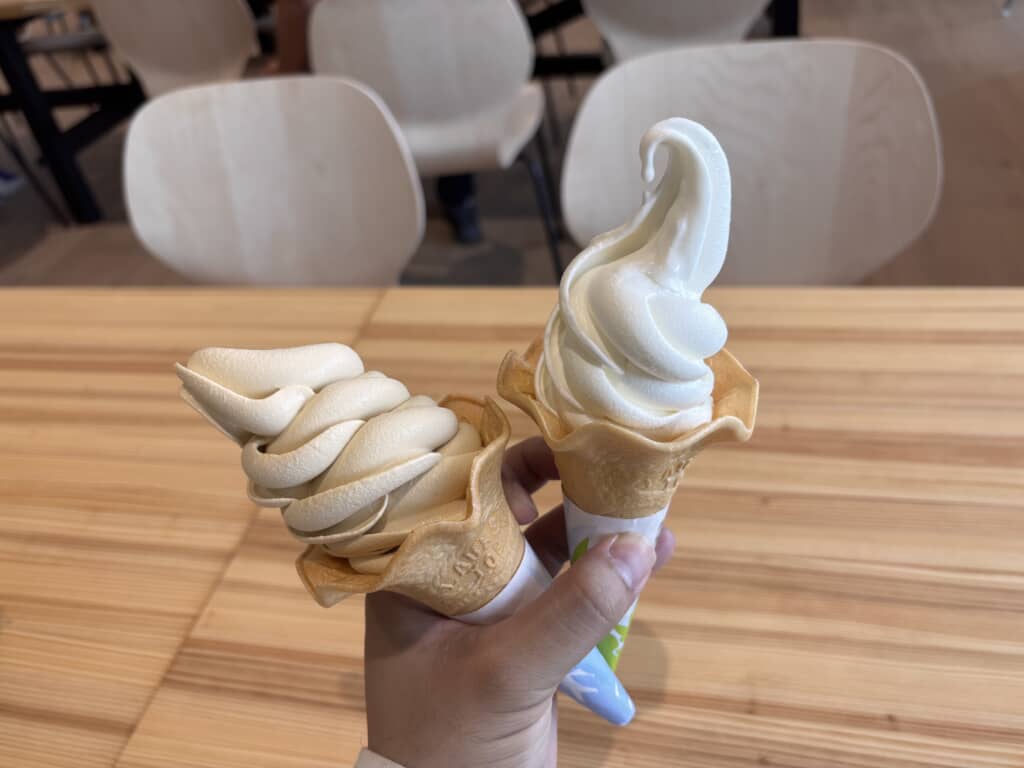第2位は愛知県の名物八丁味噌の風味を感じられる「八丁味噌ソフトクリーム」です。写真左が八丁味噌ソフトクリームで、写真右が知多半島では知らない人はいないというほど人気の「常滑牛乳ソフトクリーム」です。八丁味噌の豊かな風味と少し独特な味わいが癖になるここだけでしか味わえないソフトクリームです。どちらも食べたいという方にはミックスもあります。ミルクと味噌のうま味が合わさった唯一無二の味わいを提供してくれます。