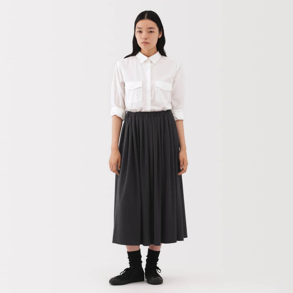 レビューでは「昨年購入できず、再販を願っていました」「今の時期から長いシーズンはけそうなスカートです」「ポプリンレギュラーカラーシャツのブルーストライプに合わせて、ネイビーを購入。丈も良い感じ。落ち感も良き」「とろみのある生地で動きが綺麗」「杢調グレーは万能」などの声が寄せられています。