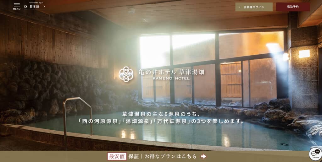 第2位は「亀の井ホテル草津湯畑」で、得票率は5.8%でした。草津温泉のシンボルである湯畑までは徒歩約3分とほど近く、観光の拠点にもぴったりなホテルです。