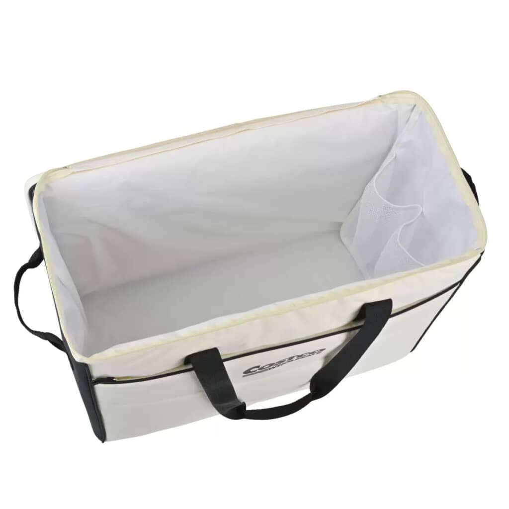 コストコの「コストコ クーラーバッグ キルト生地」は、キルト素材でできており、高密度断熱材を使用したクーラーバッグ。53×25×41センチと容量が大きく、とにかく物がたくさん入るのが特徴です。内側にはメッシュ素材のワインホルダーが付いているのもうれしいですね。外側にあるフロントポケットにも収納可能なため、ちょっとした荷物を入れるのにも便利。