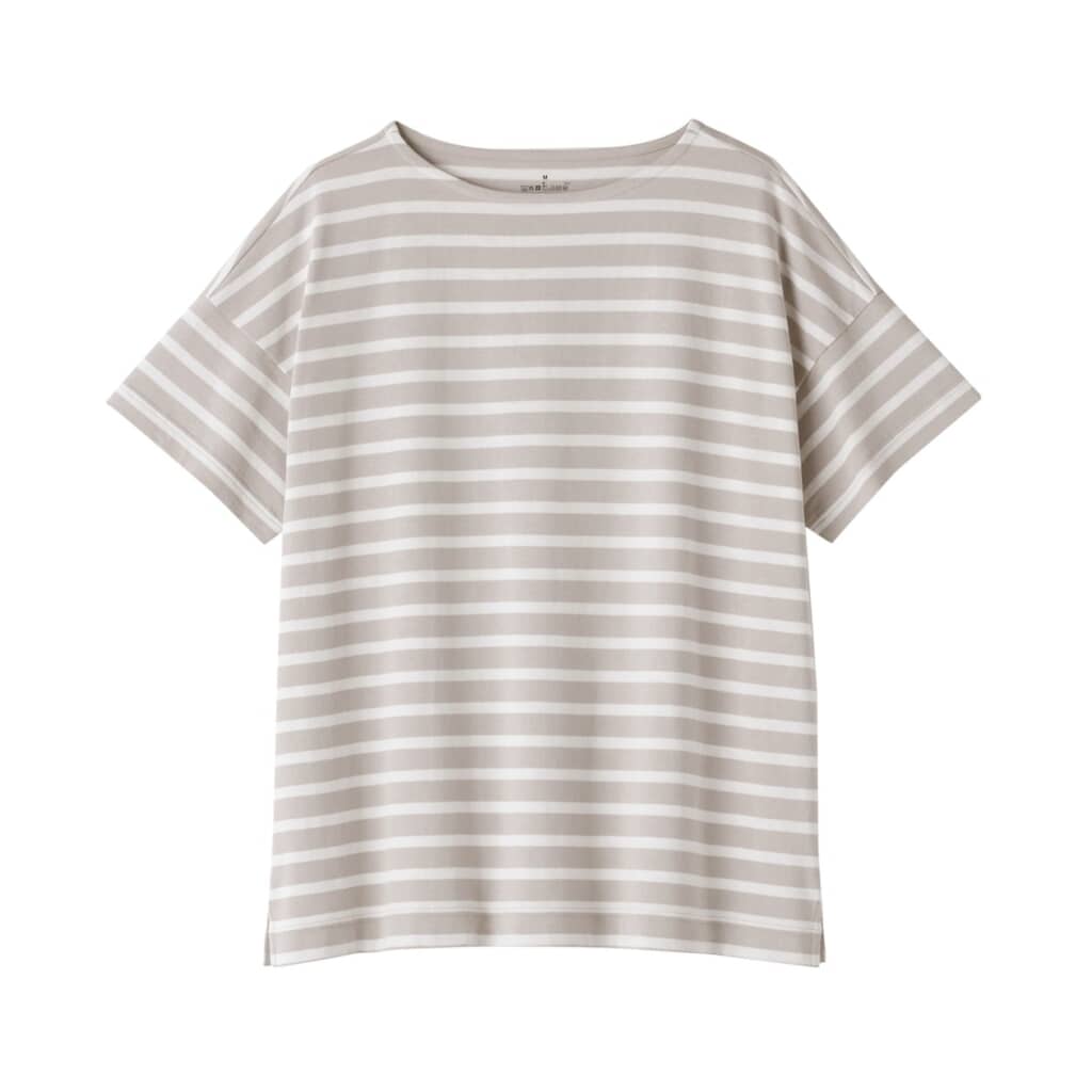 第2位は「婦人 天竺編みクルーネック半袖Tシャツ」(税込990円)でした。アフリカの自然に育まれた綿と再生ポリエステルを使用した、さらりと肌なじみの良い素材のTシャツ。綿100%に比べて乾きやすく、快適な着心地が魅力です。前シリーズからデザインとフィット感を見直し、一枚でもインナーとしても活躍する汎用性の高い一着に。着丈や襟のバランスにもこだわり、インナー感が出にくい設計がポイントです。カラーは白・黒といった無地のベーシックからボーダーまで、豊富な種類をラインアップしています。