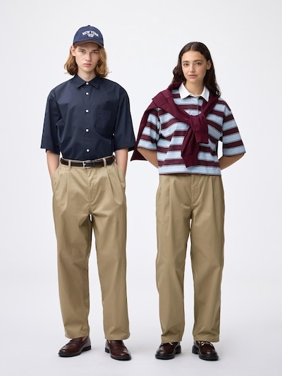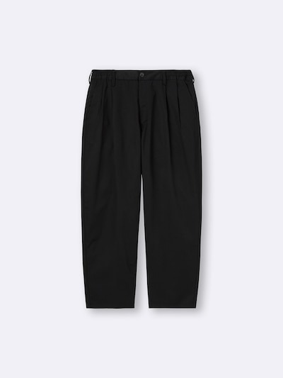「チノキャロットパンツ(丈標準69.5~73.5cm)」(2990円)は、裾に向かって緩やかに細くなる、キャロット型のワイドテーパードシルエットが特徴のアイテム。360度どこから見ても美しいシルエットが魅力です。ウエストはゆったりとしたツータック仕様で、ゴム入りの快適な履き心地になっています。スピンドルコードとベルトループを備えており、好みに合わせたウエスト調整も可能。ハリのあるチノ素材を使用しているため、カジュアルからクリーンな着こなしまで幅広く対応しています。カラーは「BLACK」「BEIGE」「OLIVE」の3色展開。サイズはユニセックスでXS~3XLまでそろえています。