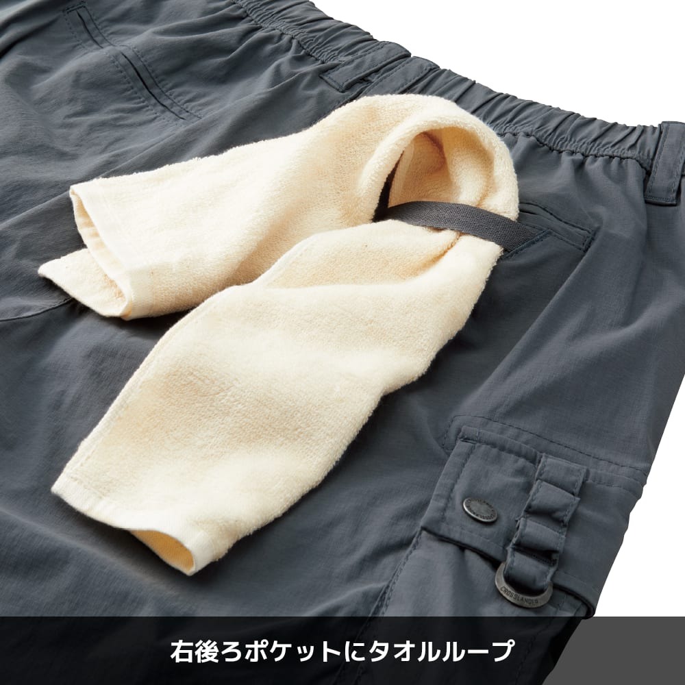 右カーゴポケットフラップにはマルチフックとDカン、右後ろポケットにはタオルループを搭載し、小物やタオルの携帯に便利です。サイズはM・L・LL・3L(3Lはブラックのみ)、カラーはブラック・ペイズリーベージュ・ブルーグレーの3色展開。設計と機能性のバランスが光る、ワークマンファン必見の実用性に富んだショートパンツです。