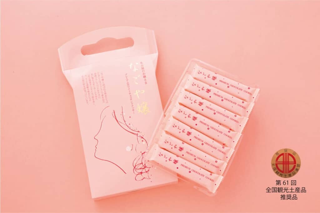 同商品は、創作スイーツ「小倉あんパフェ」をイメージして作られた一品。フリーズドライの小倉あんとコーンフレーク入りのホイップチョコを、紅ほっぺ(イチゴ)ピューレを使ったクッキーでサンドしています。サクサクとした食感がおいしいと評判のお土産です。