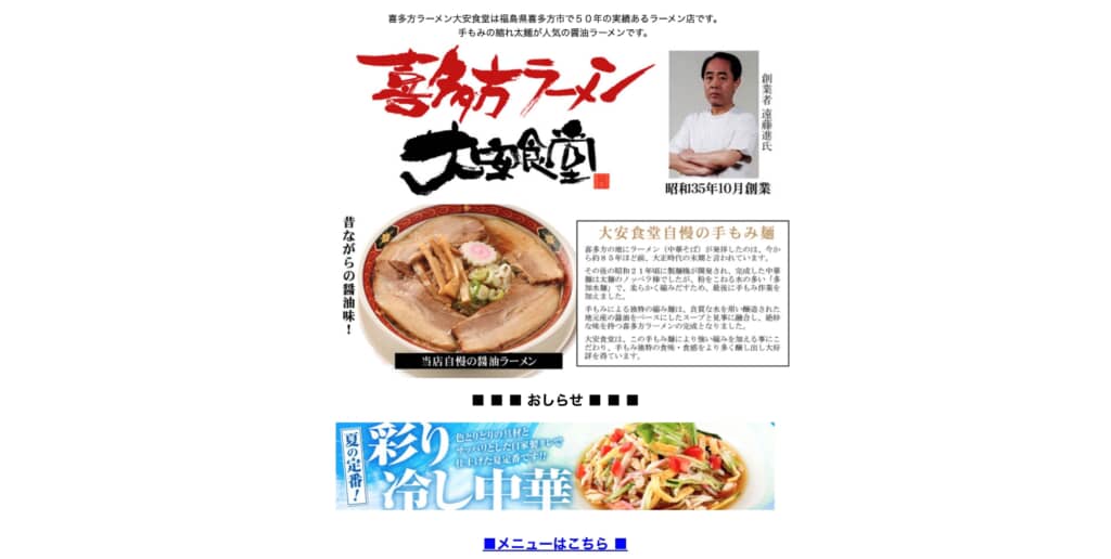 中太縮れ麺にキリッとしたしょうゆスープ、自家製チャーシューを使用した定番の「ラーメン」をはじめ、良質な背脂がたっぷりとのった同店人気No.1「じとじとラーメン」などのメニューを提供しています。午前7時から営業しており、喜多方おなじみの朝ラーが楽しめるのもうれしいポイントです。