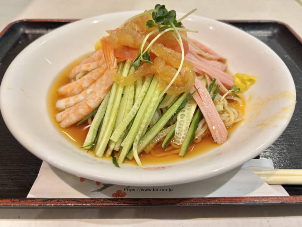 博多駅から徒歩約1分の場所にある「名代ラーメン亭 博多駅地下街店」は、博多ラーメンの老舗です。こちらの冷やし中華はごまだれタイプで、ハムや卵などの定番具材に加え、アクセントとしてパイナップルをトッピング。見た目にも清涼感があり、さっぱりとした味わいで暑い日にも食べやすいと評判です。野菜もたっぷりとれる、夏ならではのメニューとして親しまれています。