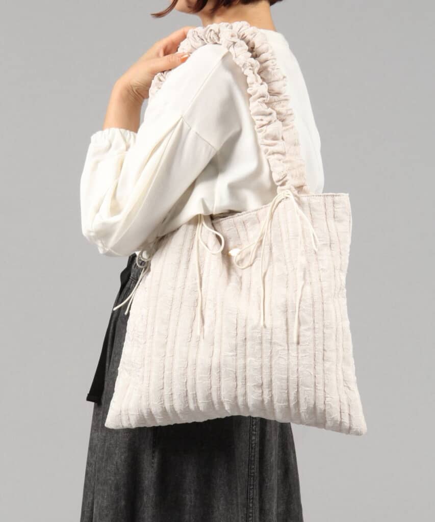 本記事ではそんなニコアンドの「tiny tiny」から販売されている、オン・オフ使えるフェミニンな雰囲気が魅力の「ギャザーリボントートバッグ」について紹介します。