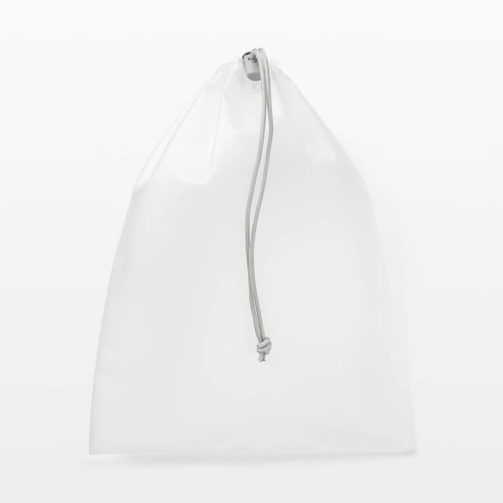 無印良品の「TPU巾着」は、洗面ポーチに使われている水に強い透明な素材を使用したアイテム。仕分けや汚れ物を持ち運ぶ際に便利です。使用した折り畳み傘を入れたり、大浴場へケア用品を持ち込む際に利用したりと、幅広いシーンで活躍します。
