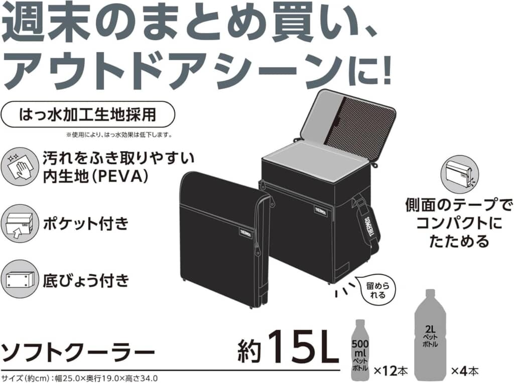 サーモスの「ソフトクーラー 15L オールブラック RFD-0151 ALB」(Amazonオンラインでの販売価格は税込2700円)は、約15リットル容量のボックス型ソフトクーラーです。500mLペットボトルなら12本、2Lボトルなら4本を収納でき、日常からアウトドアまで幅広く活躍します。