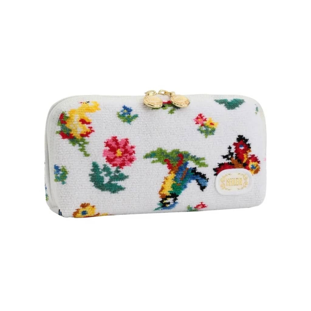 「ハイジ 便利ポーチ HE-166028(銀座・WEB限定)」は、てんとう虫やちょうちょ、小鳥、小さな花をあしらったハイジ柄が目を引くポーチです。大きく開くラウンドジップ仕様で中が見渡しやすく、内装は中央にジップポケット、両サイドにオープンポケットとカードポケットを備えています。内ポケット構成は、ファスナーポケット1、オープンポケット4、カードポケット8。長財布としても使用できます。カラーはホワイト/ブラック/ベージュの3色展開。限定仕様ならではの特別感があり、贈り物にも自分用にも選びやすい一品です。