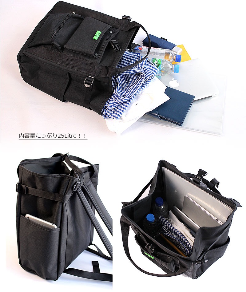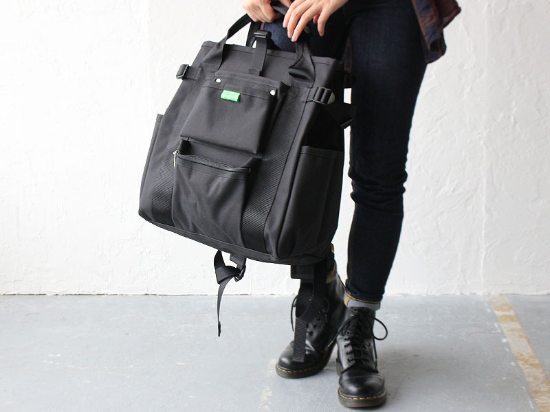 容量は25L。メインルームはあえてポケットを設けないシンプルな構造にしており、大きめの荷物もストレスなく収納可能です。前面には工具袋をイメージした鋲付きのオープンポケットとファスナーポケットを備えており、スマートフォンやキーケース、財布などの小物を分けて収納するのに便利です。持ち方はリュックとして背負うだけでなく、トートバッグとしても使用できる2WAY仕様。用途やシーンに応じて自由に使い分けられるのが魅力です。