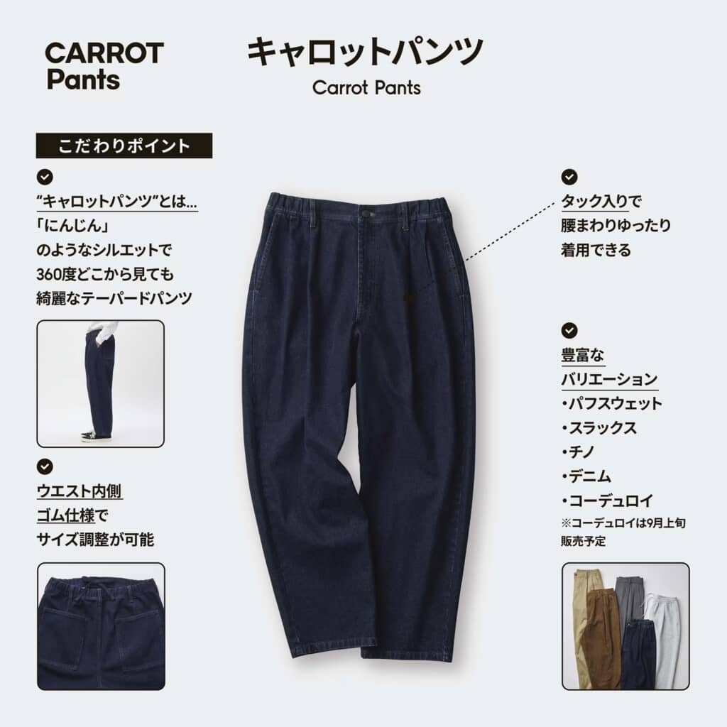 GUの「パフスウェットキャロットパンツ(丈標準69.0~73.0cm)」は、適度なハリ感を持たせたダブルフェイス素材を使用したパンツ。ウエストにはワンタックが施され、立体感のあるシルエットを実現することにより、上品さと快適さを兼ね備えています。ウエストはゴム仕様のため、リラックスした穿き心地。裾にかけて細くなるキャロットのようなワイドテーパードシルエットは、どの角度から見てもきれいに見えるデザインなのが魅力です。カジュアルからきれいめまで、幅広いスタイルに合わせやすい一本なのもうれしいですね。カラーは、03 GRAY・07 GRAY・09 BLACK・69 NAVYの4種類、価格は2990円で販売されています。