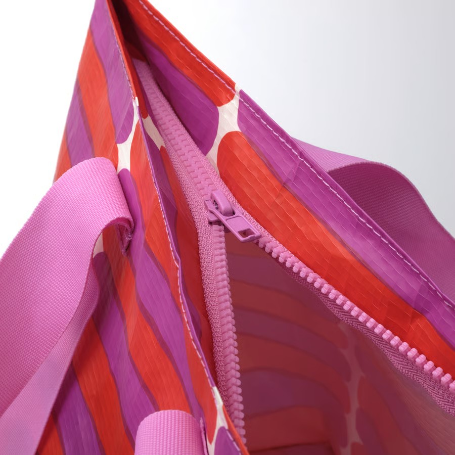 IKEAの「バストゥア」(999円)は、フィンランドの人気ブランドMarimekko(マリメッコ)とのコラボによって誕生したアイテム。鮮やかなピンクが目を引くデザインとなっており、お出かけが楽しくなるようなバッグに仕上がっています。素材には丈夫で軽量なポリプロピレン100%で水洗いが可能な仕様。容量は約7リットルと、ちょっとしたお出かけや収納に適したサイズです。バッグにはファスナーが付いており、中身をしっかり守れます。