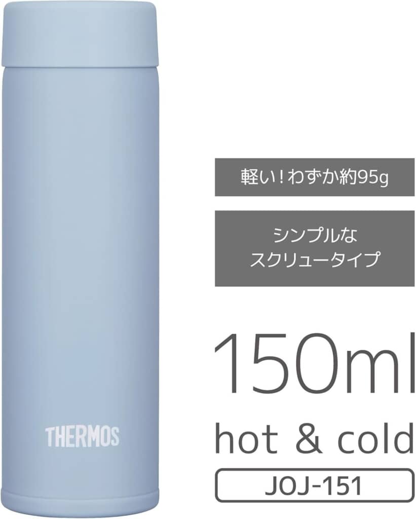 サーモス「真空断熱ポケットマグ JOJ-151」は、150mlの超小容量サイズのマグ。約幅4.5×奥行4.5×高さ14.5センチ・約0.1キログラムと軽く、ポケットや小さなバッグにもすっと収まります。ステンレス製魔法びん構造で6時間後も保温55度以上・保冷11度以下をキープ。フタはしっかり閉まるスクリュー式で、外せばそのまま飲める口当たりの良い設計です。