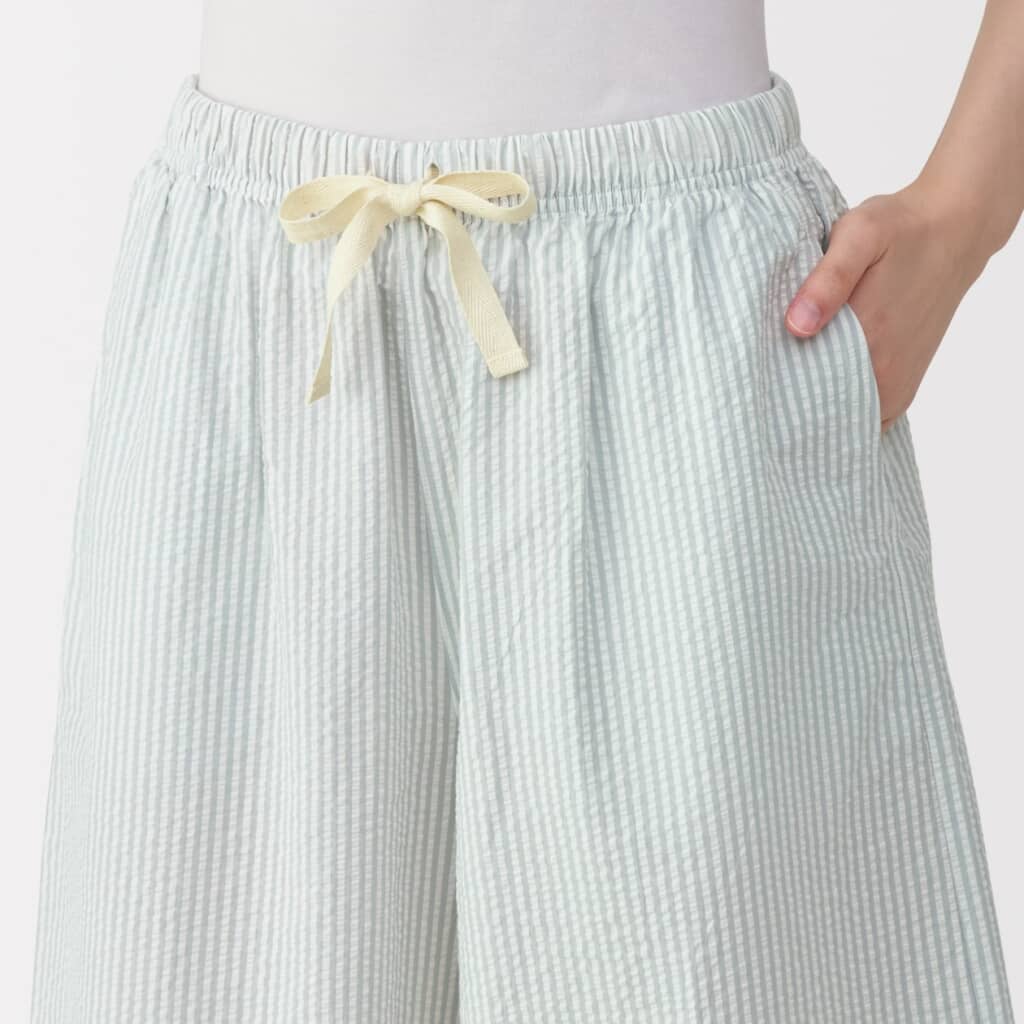 無印良品の「婦人 サッカー織 ハーフパンツ」は、オーガニックコットンを使用した凹凸のあるサッカー素材で作られ、肌に触れる面積を抑えることで汗をかいてもさらりと快適に着用可能なアイテム。ウエストはゴム仕様でリラックス感があり、夏のルームウェアにぴったりだと評判です。