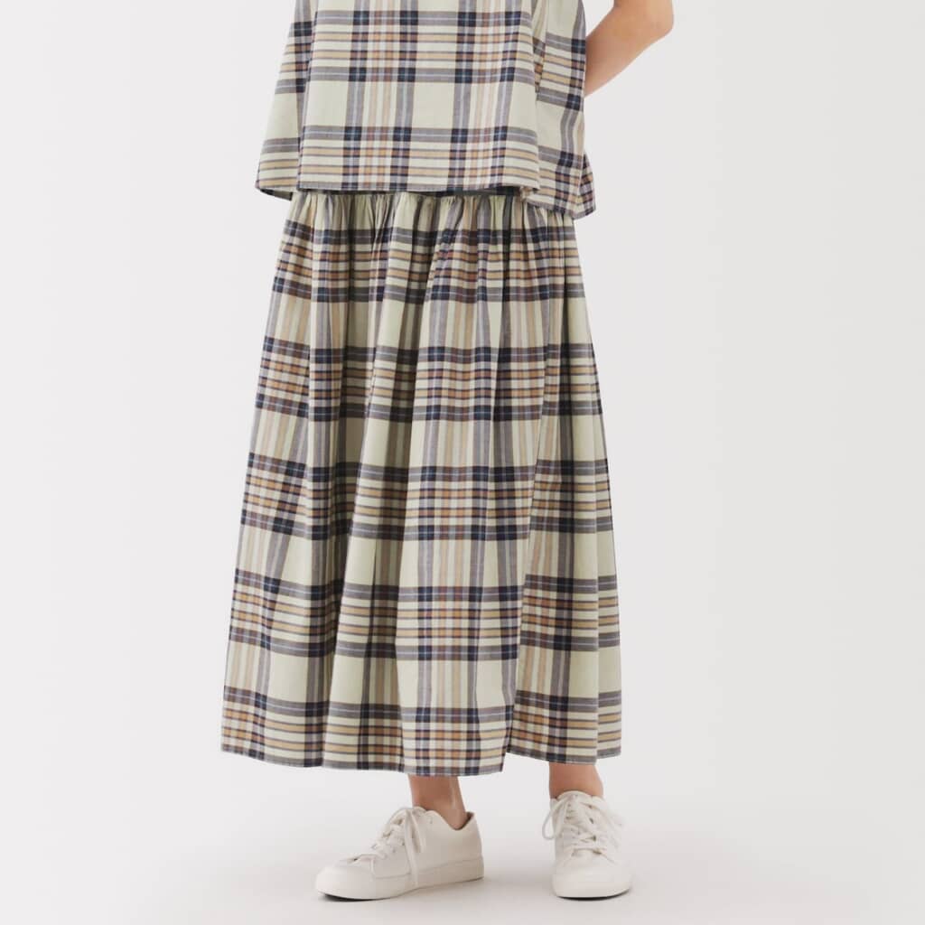 第2位は無印良品の「婦人 綿ボイル ギャザースカート」(税込4990円)でした。薄手の綿ボイル生地を使用した軽やかなはき心地が特長です。風をはらむような柔らかな素材感ながら裏地付きで透けにくく、安心して着られる仕様になっています。ウエストは総ゴム仕様に加えて内側の紐で調整ができ、体型や着用感に合わせてフィット感を整えられるのもうれしいポイントです。
