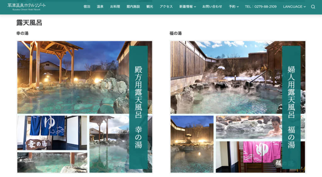 草津温泉ホテルリゾートでは、草津温泉の中でも最大級の湧出量と高温を誇る「万代鉱源泉」の100パーセントかけ流し温泉に入浴可能。大浴場に加えて、男性用露天風呂「幸の湯」と女性用露天風呂「福の湯」を備えています。