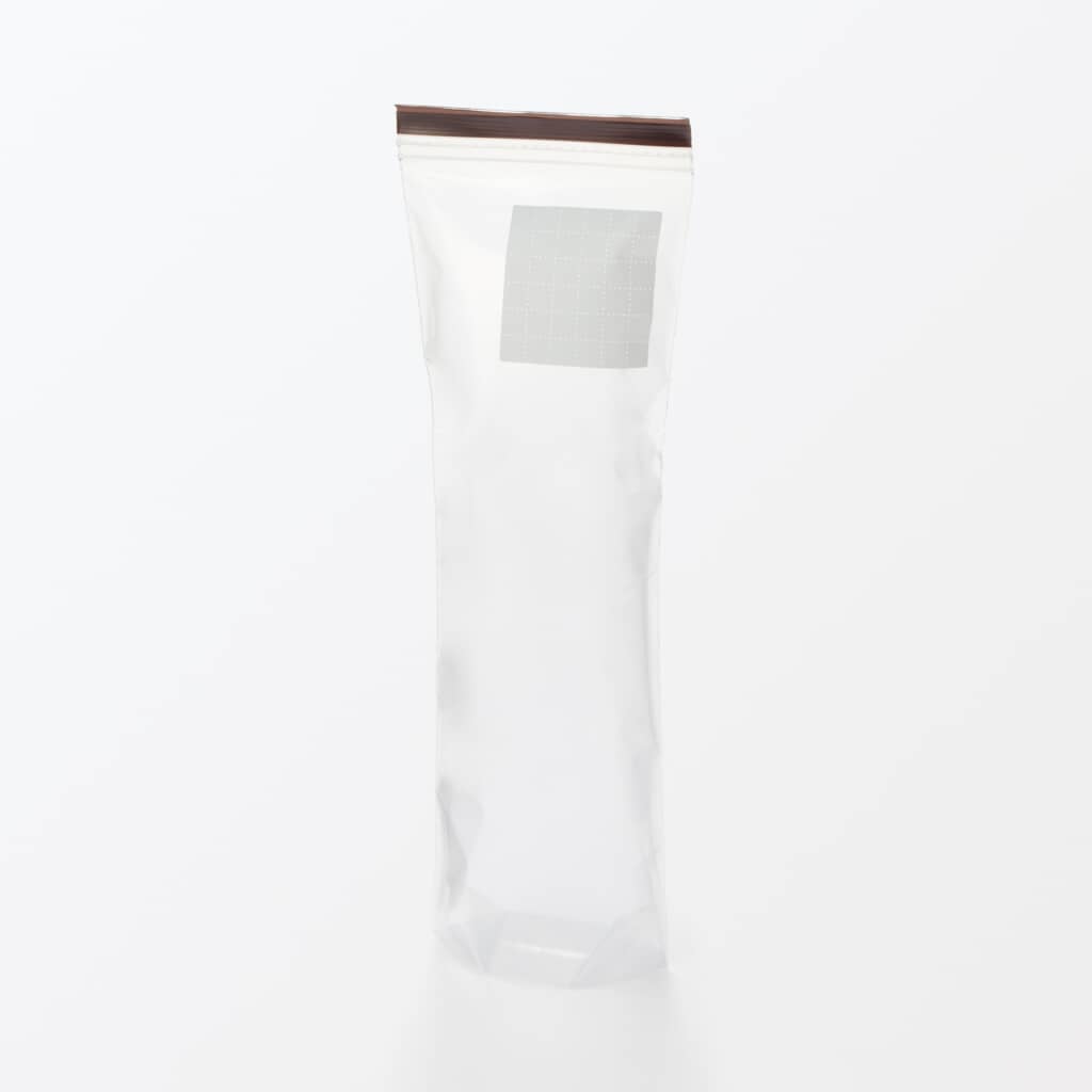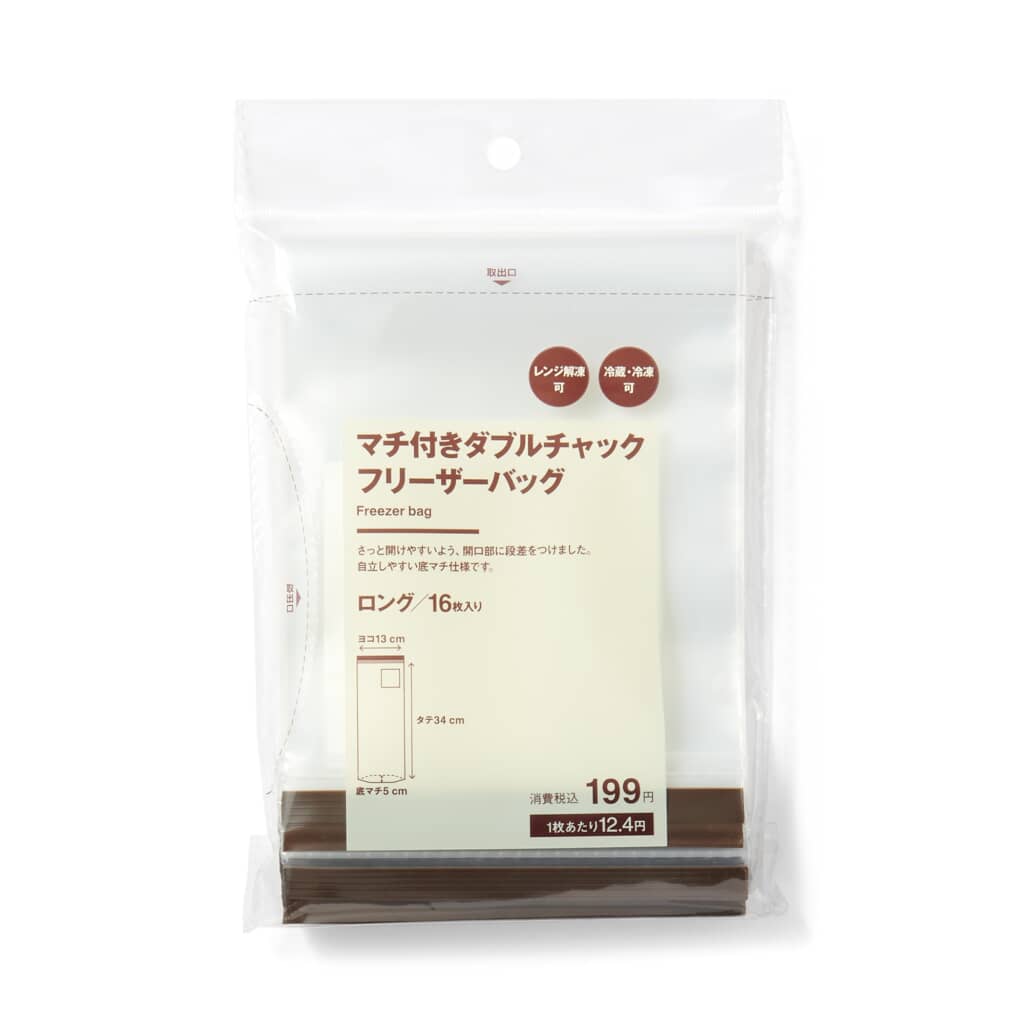 無印良品の「マチ付きダブルチャック フリーザーバッグ/ロング」(税込み:199円)は、底マチ付きで食材をつぶさずに保存できる便利な保存袋。開口部には段差があり、さっと開けやすい工夫がされています。また、ダブルチャック仕様なのでしっかり閉めることができ、保存時の安心感も高まります。さらに、開口部に色が付いているため取り出す際に識別しやすく、使い勝手が向上。サイズはロングタイプで、ヨコ13センチ×タテ34センチ×底マチ5センチと大きめの設計。16枚入りで日常の保存や下ごしらえなど幅広く活躍してくれます。SNSでは、濡れた折り畳み傘を収納する際に使用する方法がシェアされ、人気を集めているようです。