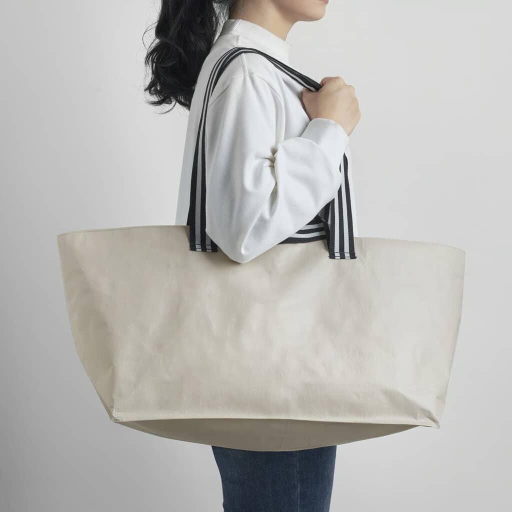 IKEAの「ヨールスニグ キャリーバッグ ライトベージュ」は、定番の大型ブルーバッグと同じ丈夫で手入れしやすいポリプロピレン素材を採用し、上部をファスナーで閉じられるのが実用的です。サイズは幅18センチ×奥行45センチ×高さ28センチで容量22リットルで、使わないときはコンパクトにたためるので収納も簡単。本体も持ち手もポリプロピレン100%で、お手入れは水で洗って自然乾燥させるだけでOK。