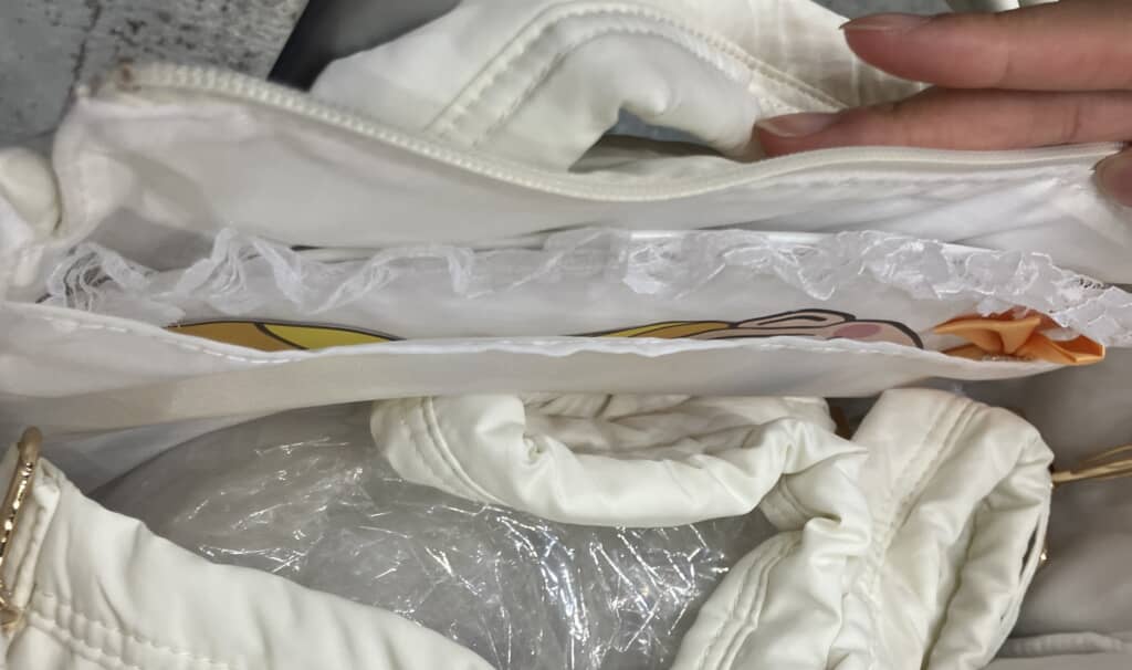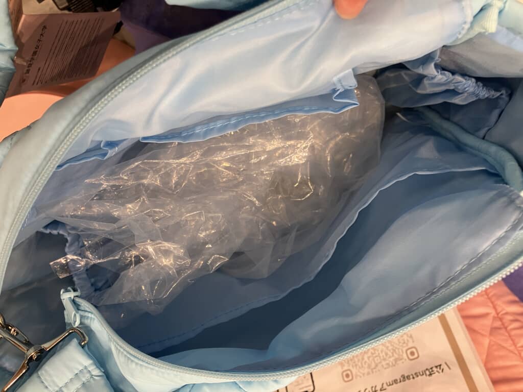 ふわっとしたキルティング素材でめちゃくちゃ軽い! 肩かけしたときに痛くなりづらそうなショルダー部分がうれしいですね。