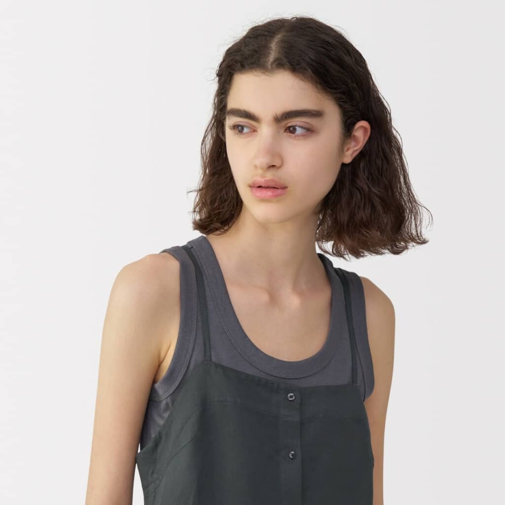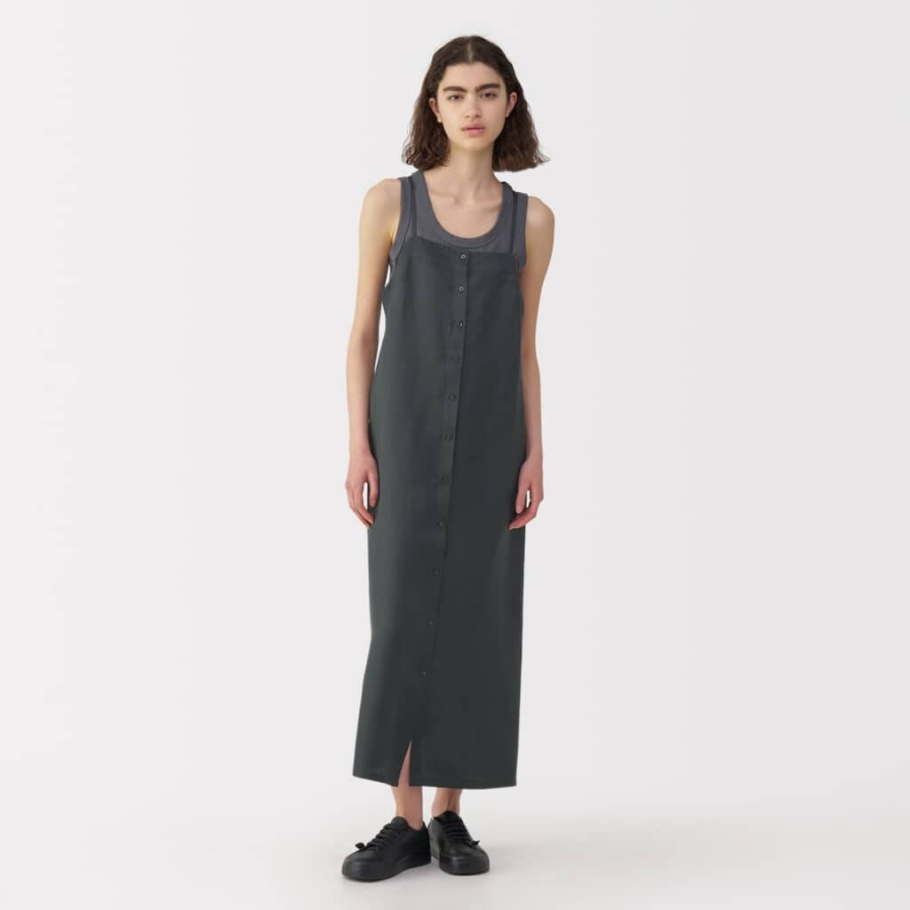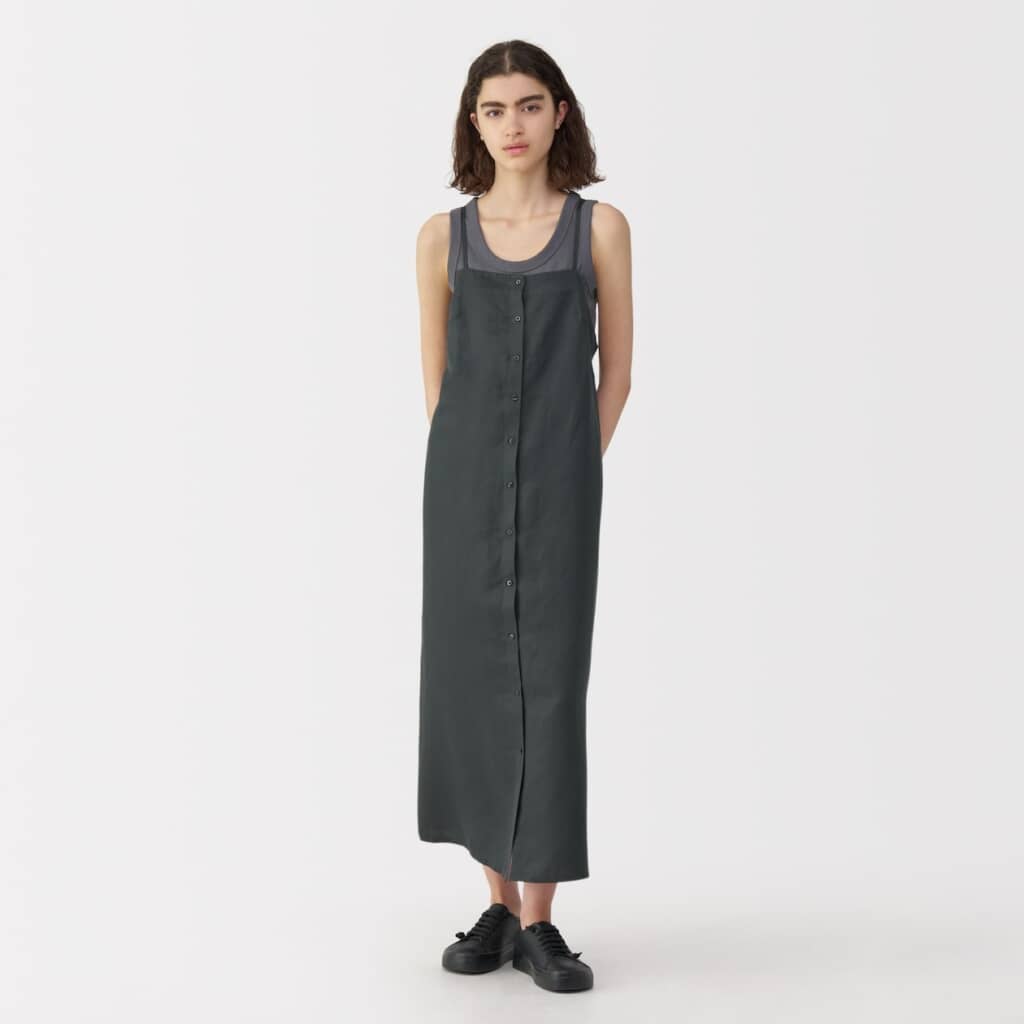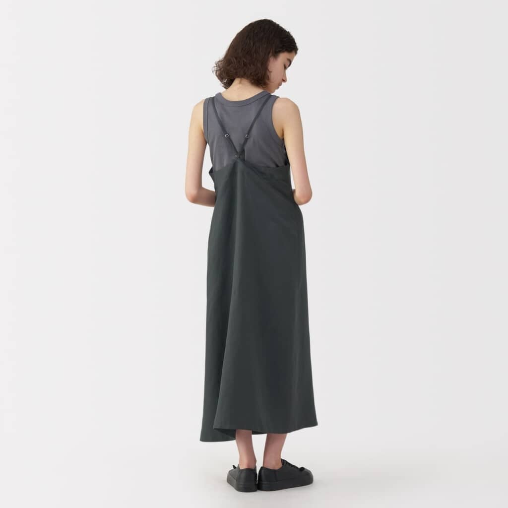 無印良品の「婦人 リネンシルクワンピース」は、シルクとリネンを組み合わせたツイル織りの生地を使ったキャミソールワンピース。なめらかな肌触りで着心地が良い同アイテムは、リネン特有のハリを抑える特殊加工によってやわらかい風合いに仕上げられており、上品さと自然な光沢も印象的です。フロントボタンのベーシックなデザインながら、後ろ姿にフレアが出るよう工夫された美しいシルエットになっているのも魅力の一つ。肩紐は調整可能で、インナーに半袖や長袖などを合わせれば季節をまたいでさまざまなレイヤードスタイルを楽しめます。