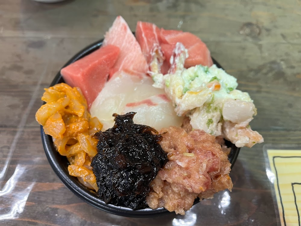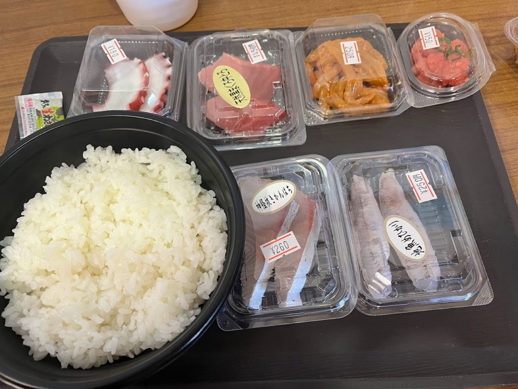 作り方はとてもシンプル。まず並んでいるネタの中から好きなものを選び、レジでご飯のサイズを選んでお会計します。スープも付いてくるので、満足度の高い一食になります。鮮度抜群の海鮮を欲望のままに選んで盛り付けるのは食べる前からワクワクします。