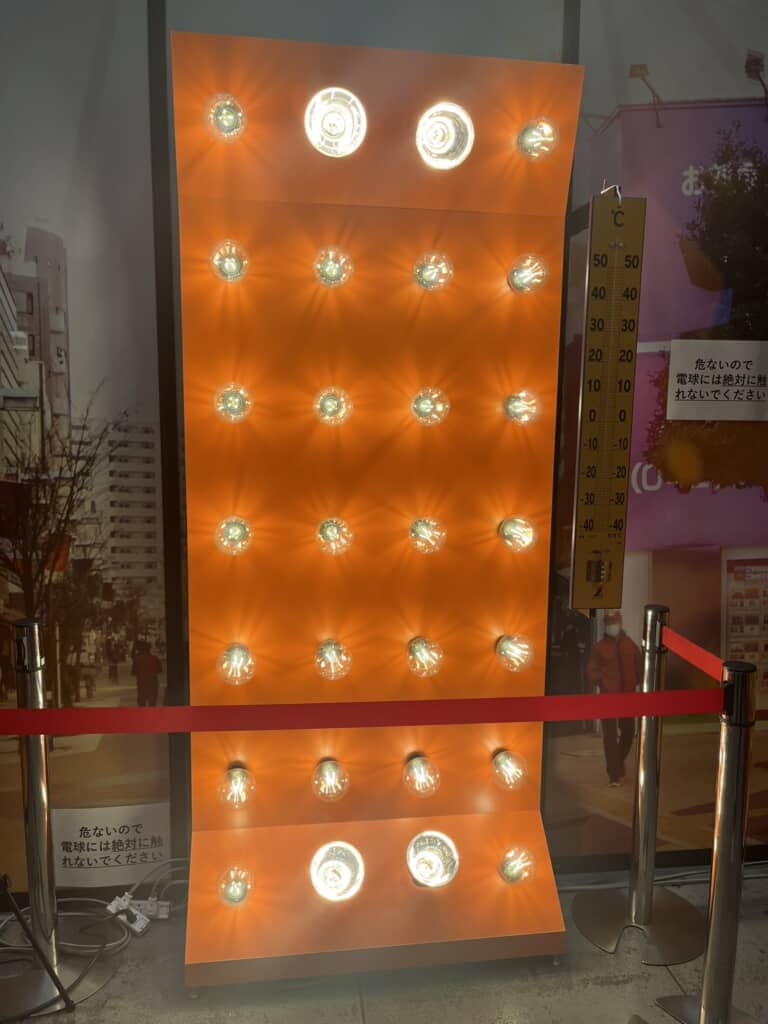 電球版の前に立ってみると、当然ですが暖かい。むしろ顔や頭、下半身(私服)は暑い。でも不思議なことに、エックスシェルターを着ている上半身は何も感じません。