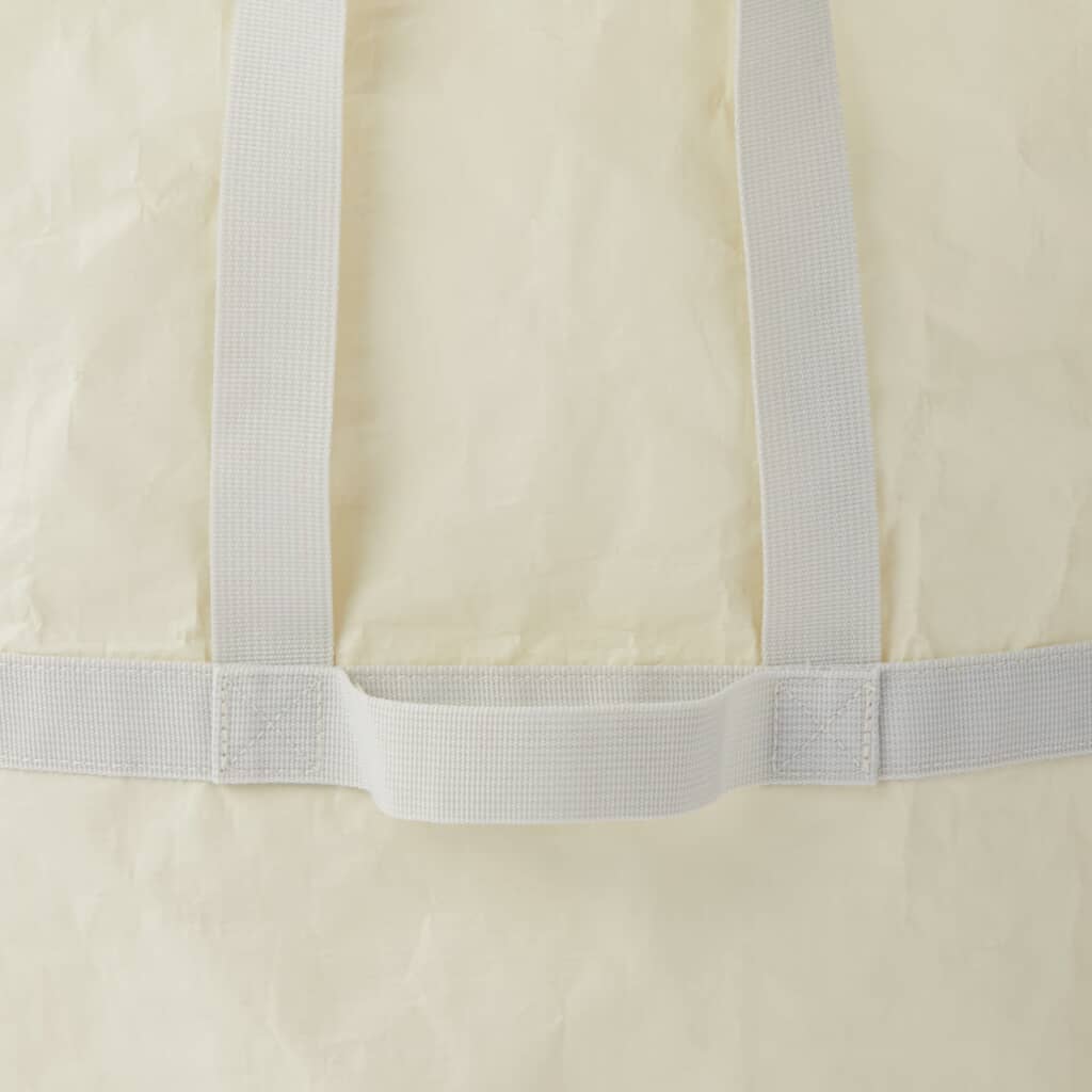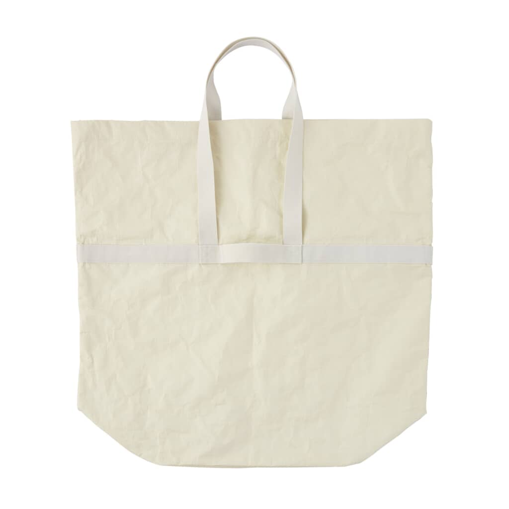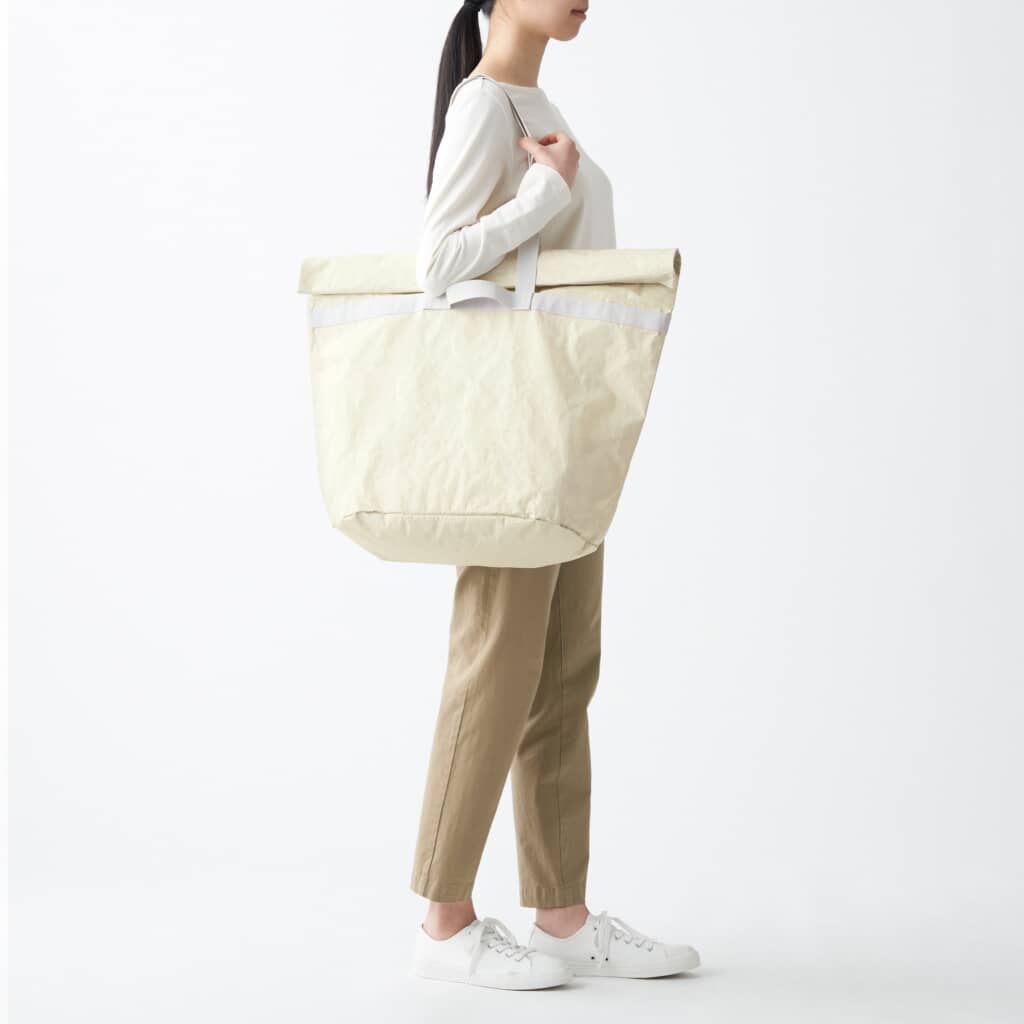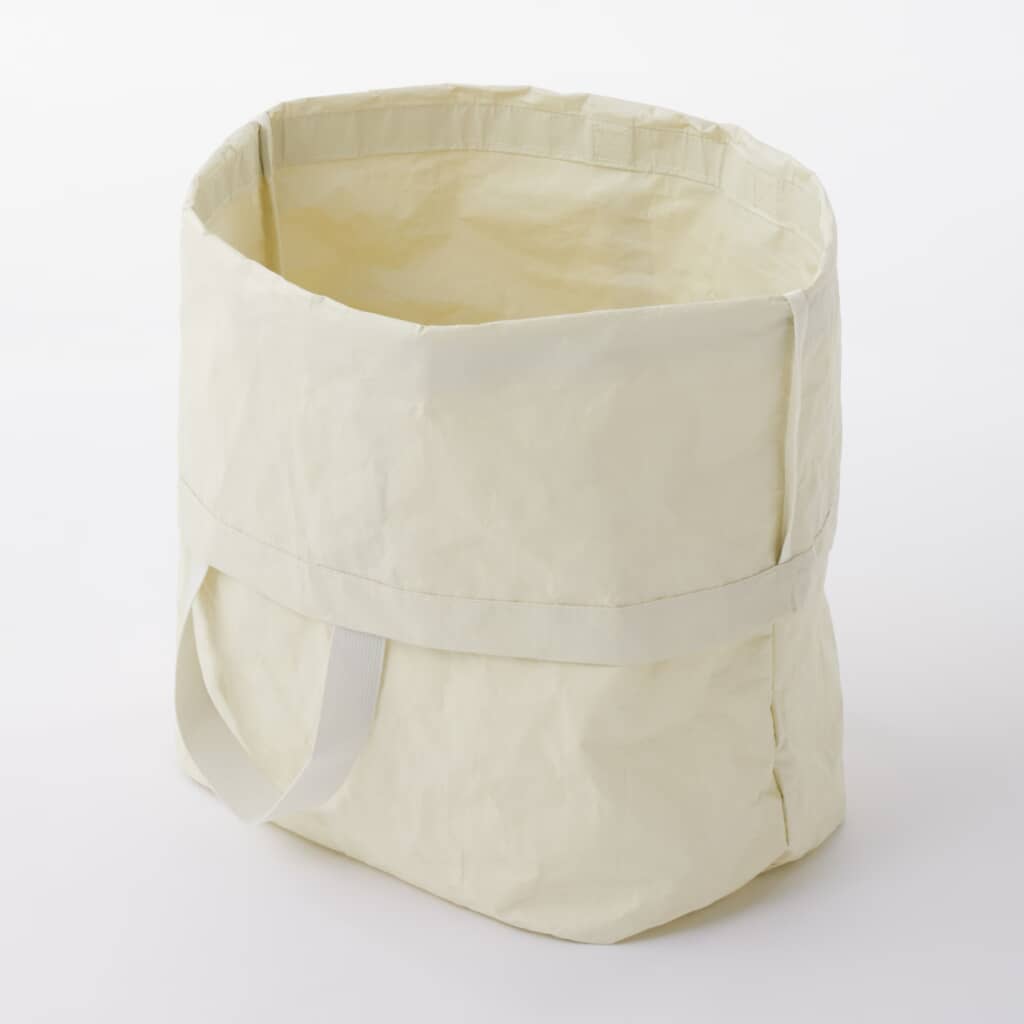 無印良品の「ポリエチレンシートランドリーバッグ」(税込み:1490円)は、洗濯物といった大量の荷物を入れたり、持ち運んだりする際に便利なバッグ。マチが大きく設計されている上、口を外に折り返せるので、自立させることができます。上部は長めなので、荷物を持ち運ぶ際には中身が見えないようにすることも可能。サイズは約40(幅)×27(マチ)×56(長さ)センチと大きめなので、さまざまな物を収納するのにも便利です。