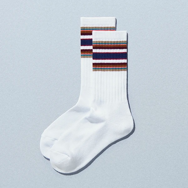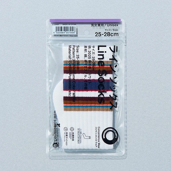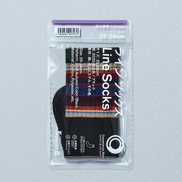 「ラインソックス 2025年秋の色」は、日常コーデに馴染むベーシックなブラックとホワイトを土台に、秋らしい配色ラインでアクセントを加えた男女兼用のソックスです。定番はブラックとホワイトの2種類で、ファミリーマートを連想できるラインがあしらわれています。