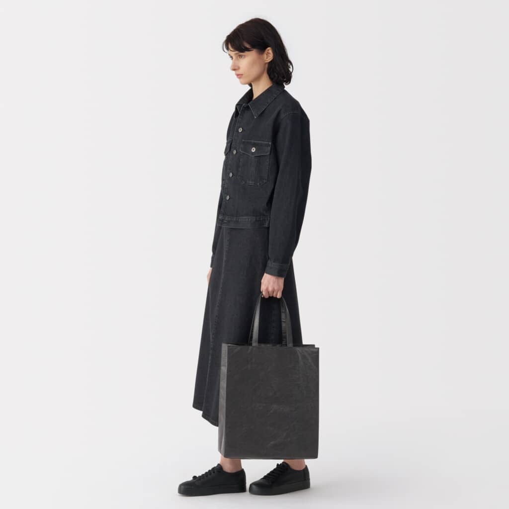 MUJI Laboの「ペーパーライクトートバッグ」は、和紙のような風合いの高密度不織布を採用。高密度ポリエチレンをランダムに絡み合わせ、熱と圧力で圧着した素材で、紙のような軽さと質感を持ちながら耐久性に優れていると説明されています。使い込むほど適度なしわが入り、表情の変化を楽しめるのも魅力です。A4収納可で書類やポーチが収まりやすく、ミニマルな横長フォルムは通勤や習い事に合わせやすいデザイン。価格は税込3990円です。レビューでは色移りに触れる声もあるため、淡色の服との摩擦や濡れ物の長時間収納は避けると安心です。